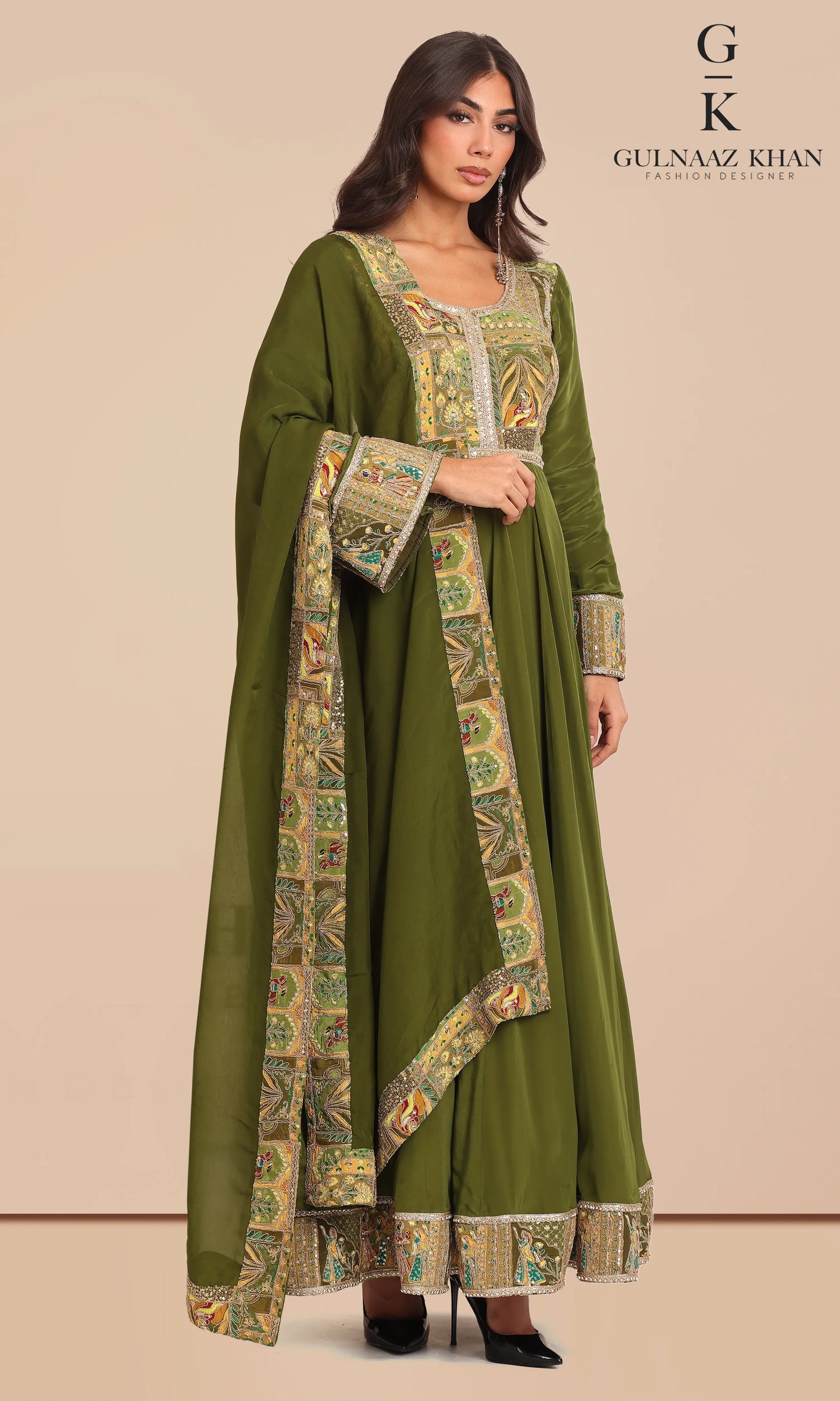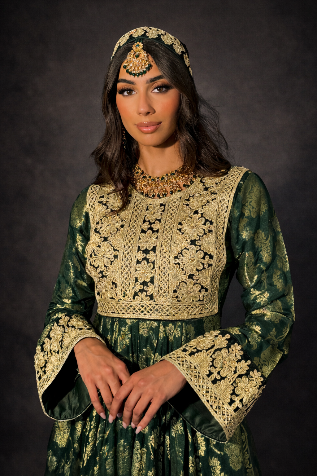 Shabnoor Green – Pure Crepe Afghan Dress with Organza Dupatta