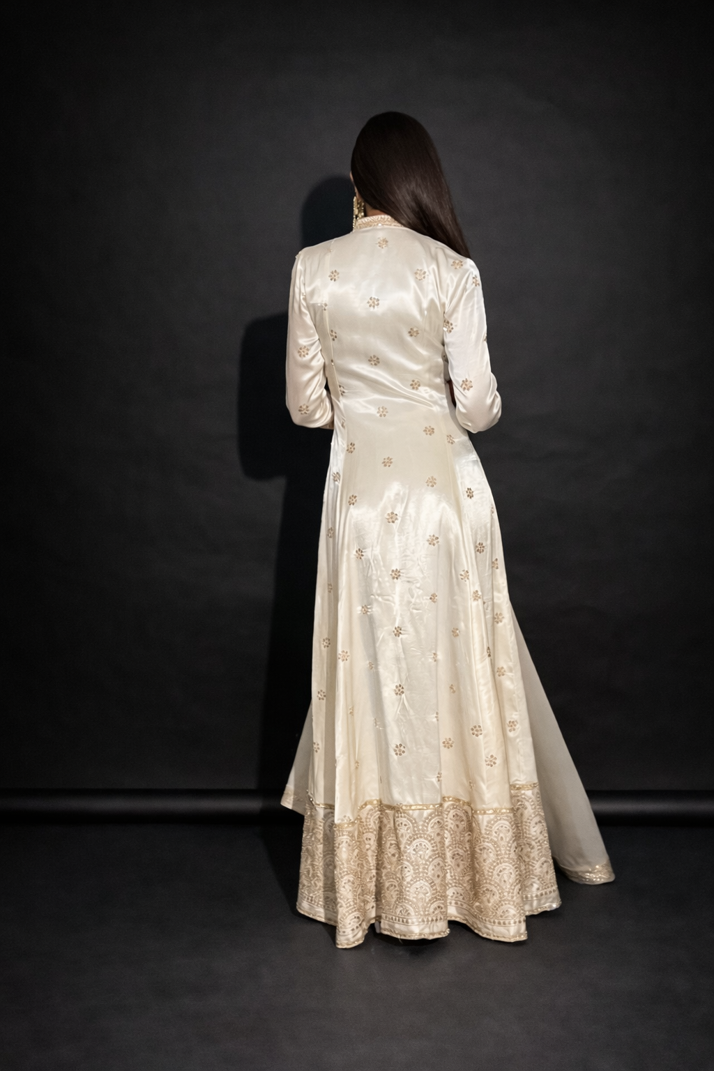 This breathtaking gown is crafted from lustrous off-white pure satin silk, renowned for its luxurious texture and graceful flow. Its open front design adds a touch of modern elegance, while the golden embroidery and sequin work intricately adorn the gown, creating a mesmerizing display of opulence and sophistication. The combination of the soft satin silk and the shimmering embellishments makes this gown a true statement piece, perfect for making a grand entrance and captivating all eyes at any glamorous event. Pair it with matching jewelry and elegant high heels for timeless elegance at any event.