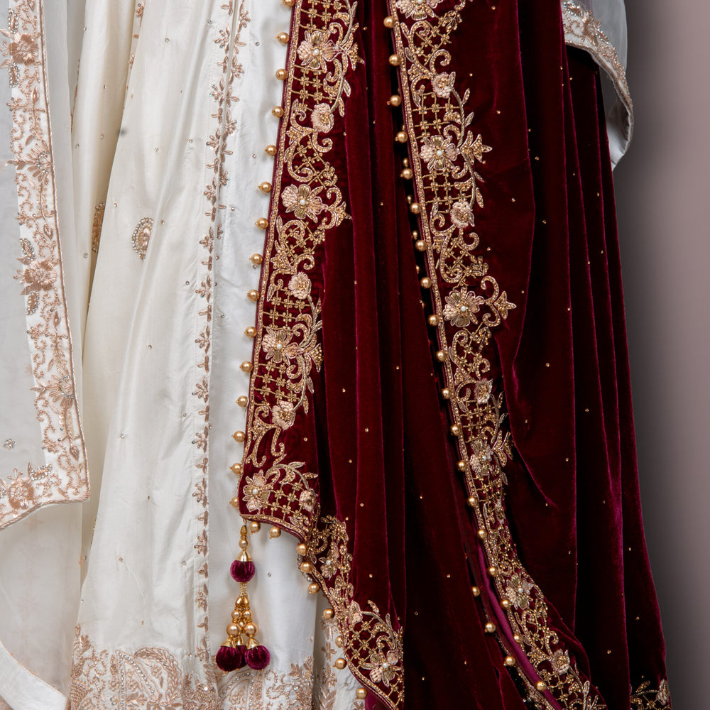 Hand embroidery with nakshi, dabka, zarkon, pearl, and stone work |