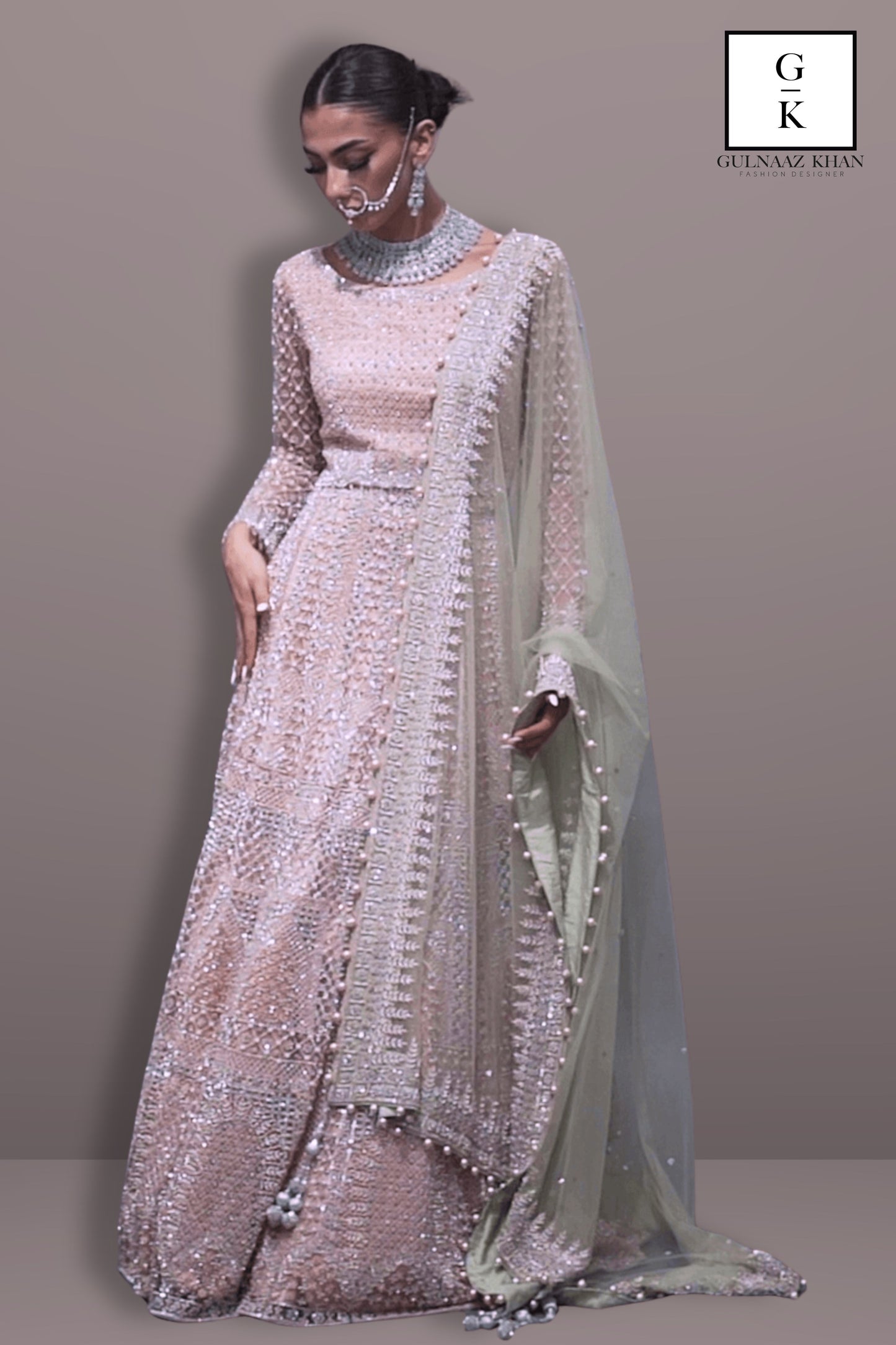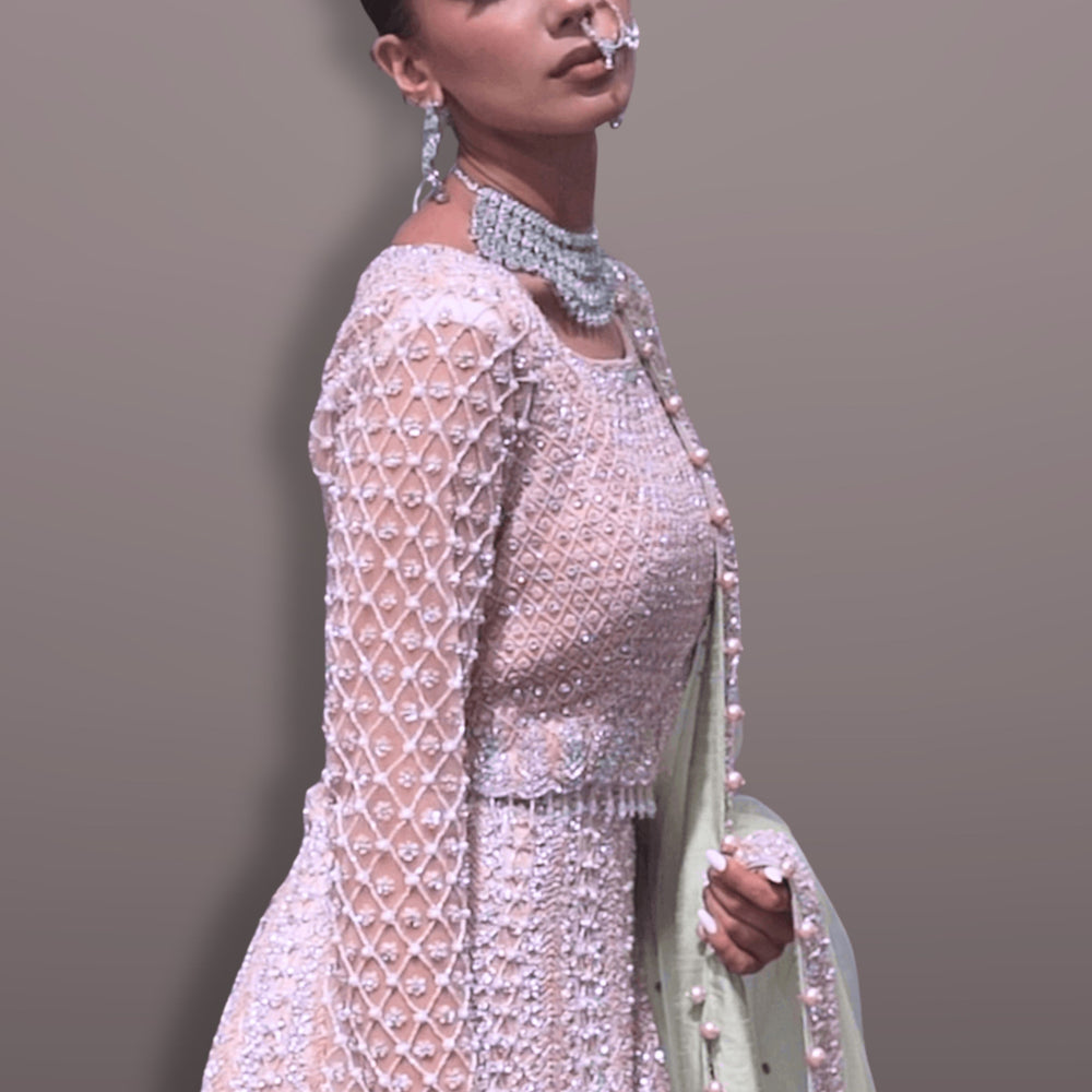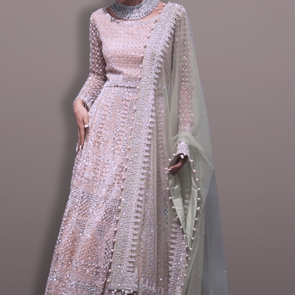Regular price $1,736.70 USDGet fierce and stay fashionable with this heavy lehenga choli. This beautiful dress is adorned with heavy pearl work in jaal pattern withΒ embroidery all over it with salli fringes on the border with pearl latkan. Dupatta also embroidered heavily on borders with stone encrusted everywhere. Paired this dress with designer jewellery to look absolutely stunning.