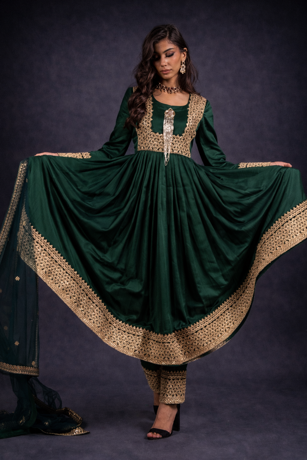 Mira – Designer Olive Green Tissue Silk Sharara Set