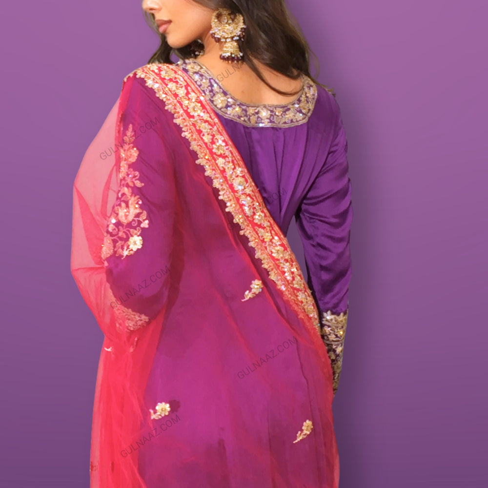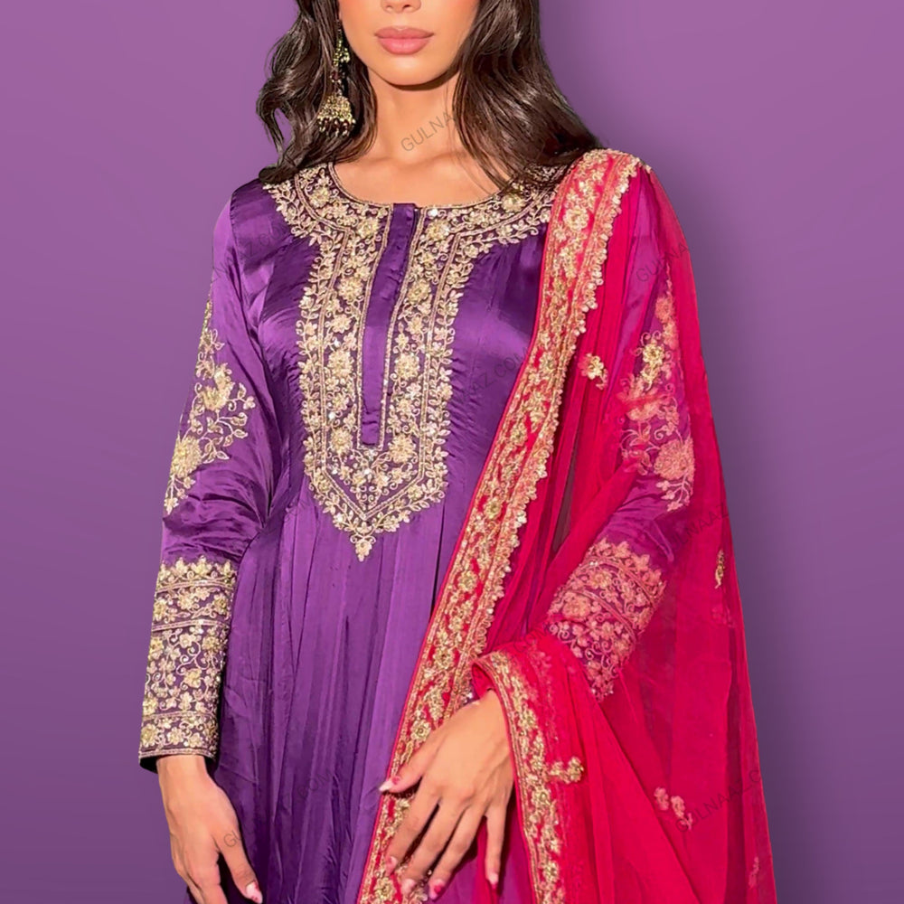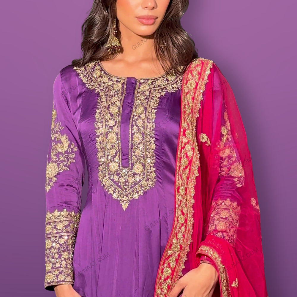 Regular price $324.75 USDMake a statement in this luxurious purple Anarkali suit from Gulnaaz Fashion. Crafted from high-quality silk, this outfit features intricate golden embroidery on the bodice, neckline, and full-length sleeves, exuding elegance and sophistication. The flared skirt is adorned with an elaborate embroidered border, adding to its regal charm and making it perfect for grand occasions.The ensemble includes a vibrant red net dupatta with matching golden embellishments, enhancing the overall appeal with a touch of vibrancy. The purple trousers feature subtle golden motifs, completing the look with finesse. This Anarkali suit is ideal for weddings and festive celebrations. Pair it with traditional gold jewelry to elevate your style and leave a lasting impression.