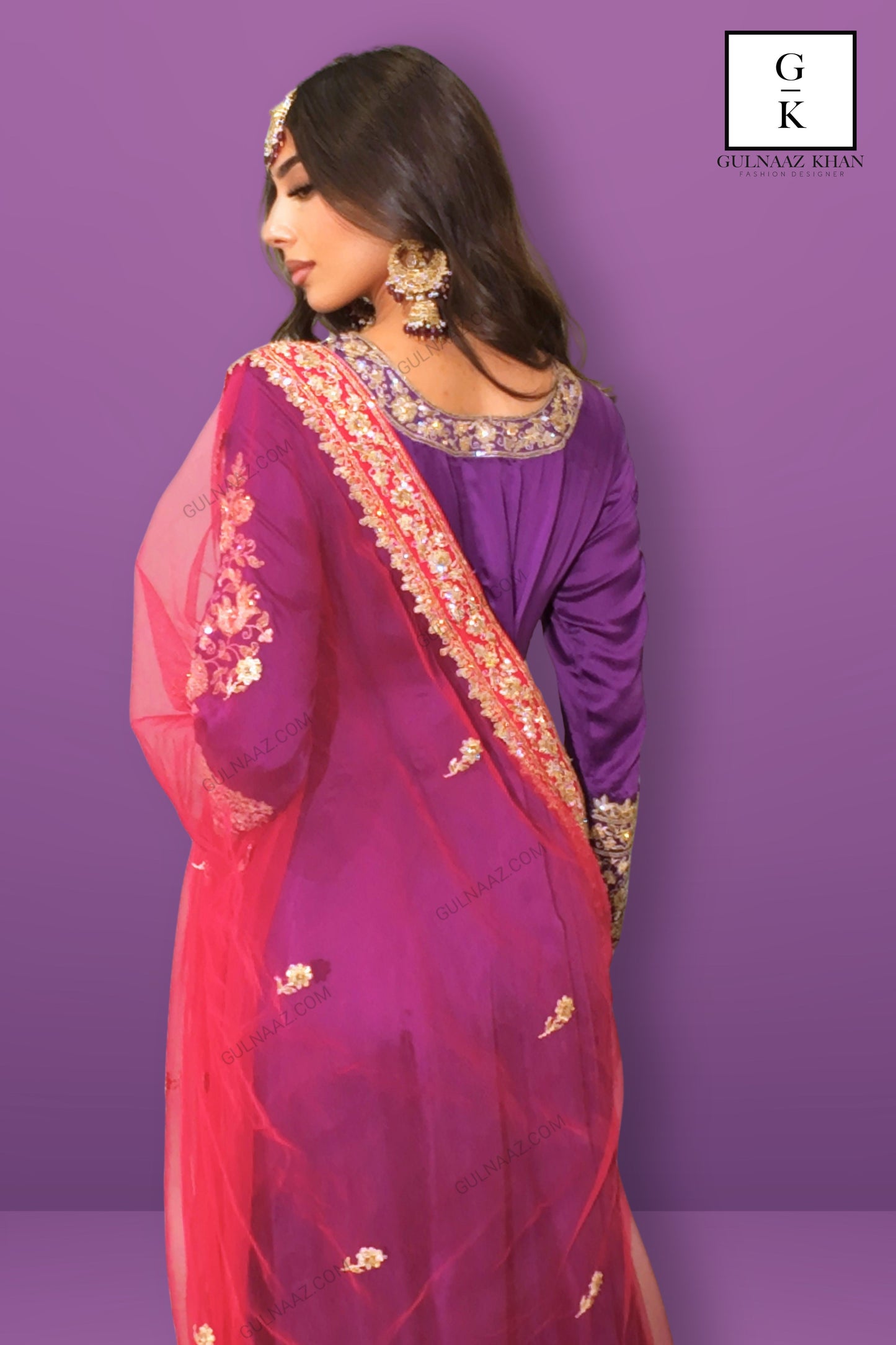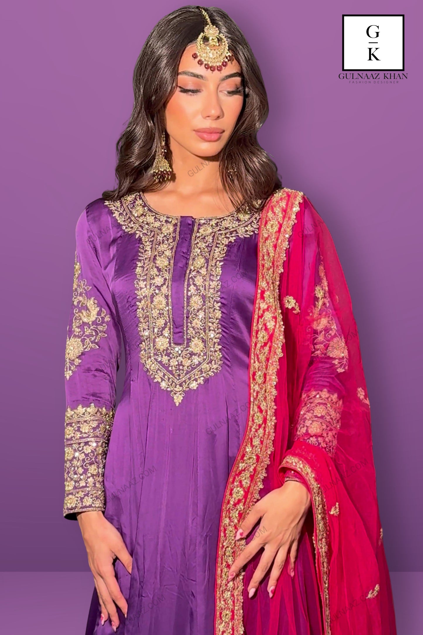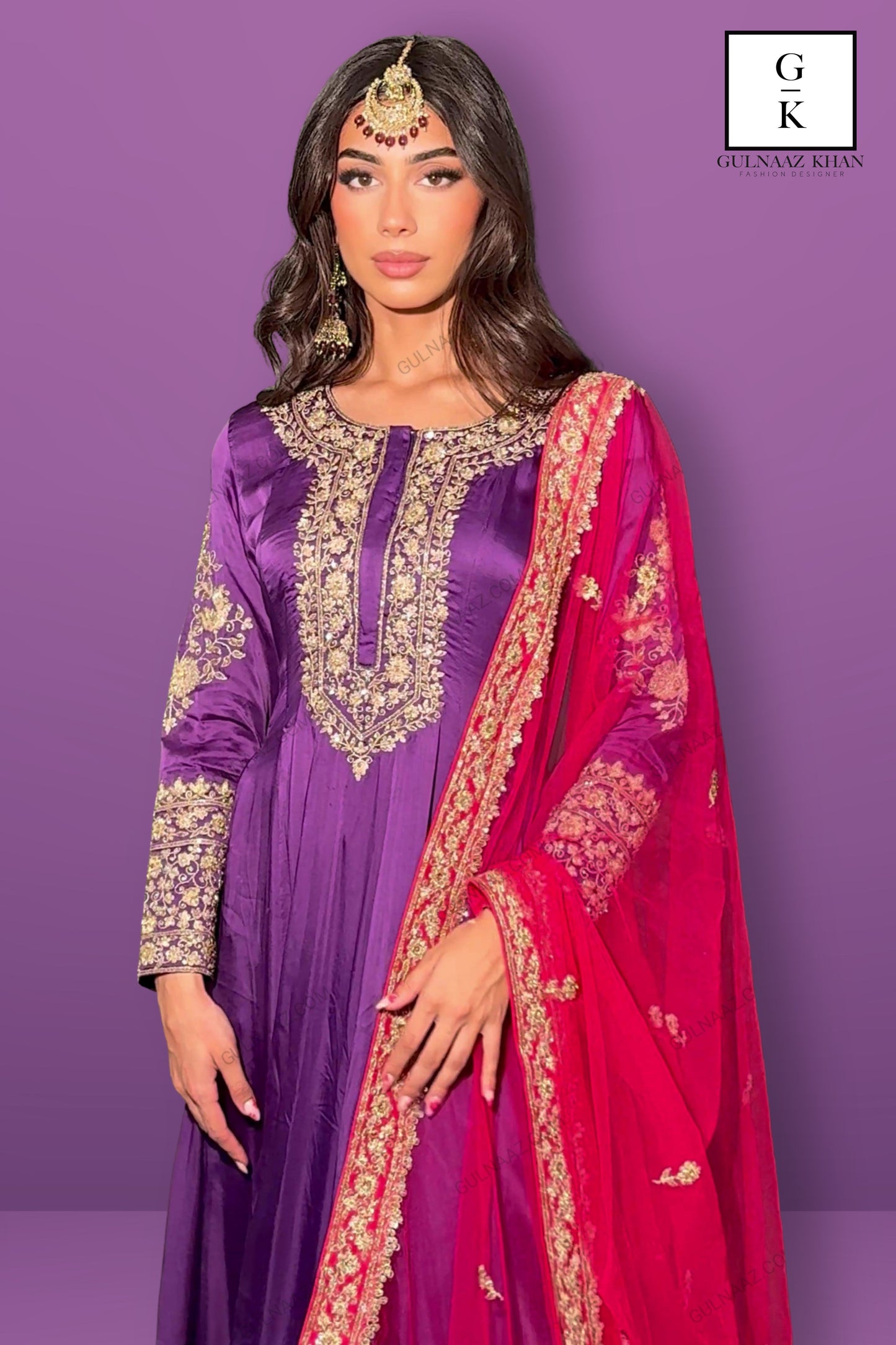 Make a statement in this luxurious purple Anarkali suit from Gulnaaz Fashion. Crafted from high-quality silk, this outfit features intricate golden embroidery on the bodice, neckline, and full-length sleeves, exuding elegance and sophistication. The flared skirt is adorned with an elaborate embroidered border, adding to its regal charm and making it perfect for grand occasions.The ensemble includes a vibrant red net dupatta with matching golden embellishments, enhancing the overall appeal with a touch of vibrancy. The purple trousers feature subtle golden motifs, completing the look with finesse. This Anarkali suit is ideal for weddings and festive celebrations. Pair it with traditional gold jewelry to elevate your style and leave a lasting impression.