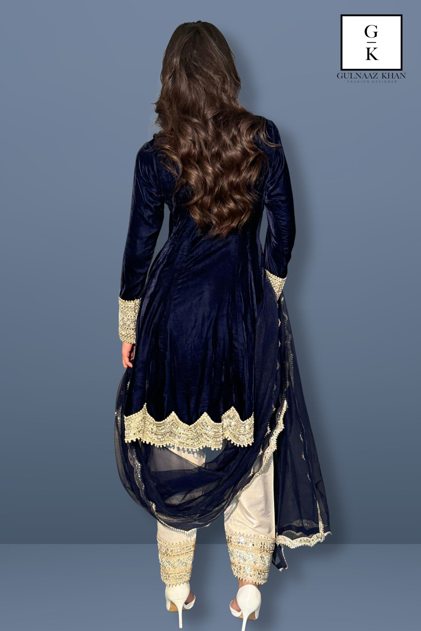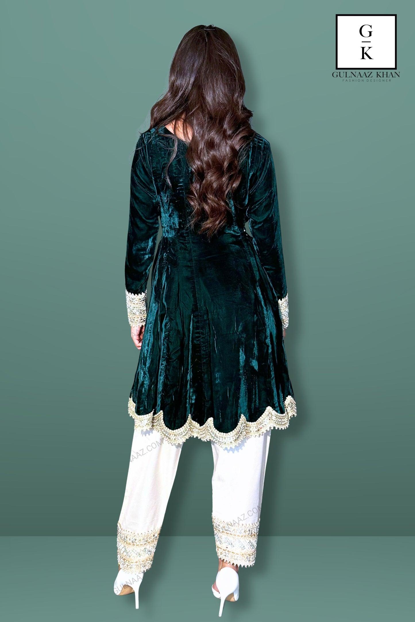 This stunning traditional outfit features a rich green velvet kameez adorned with intricate gold embroidery. The kameez has a classic neckline embellished with detailed gold work, extending down the front for a luxurious touch. The full-length sleeves are also highlighted with delicate gold embroidery, adding to the regal look.The ensemble includes matching green net dupatta with golden borders, perfectly complementing the kameez. The outfit is paired with contrasting cream silk trousers, detailed with gold embroidery at the cuffs, enhancing the overall elegance.Ideal for festive occasions, weddings, and special celebrations, this outfit combines traditional craftsmanship with modern elegance.