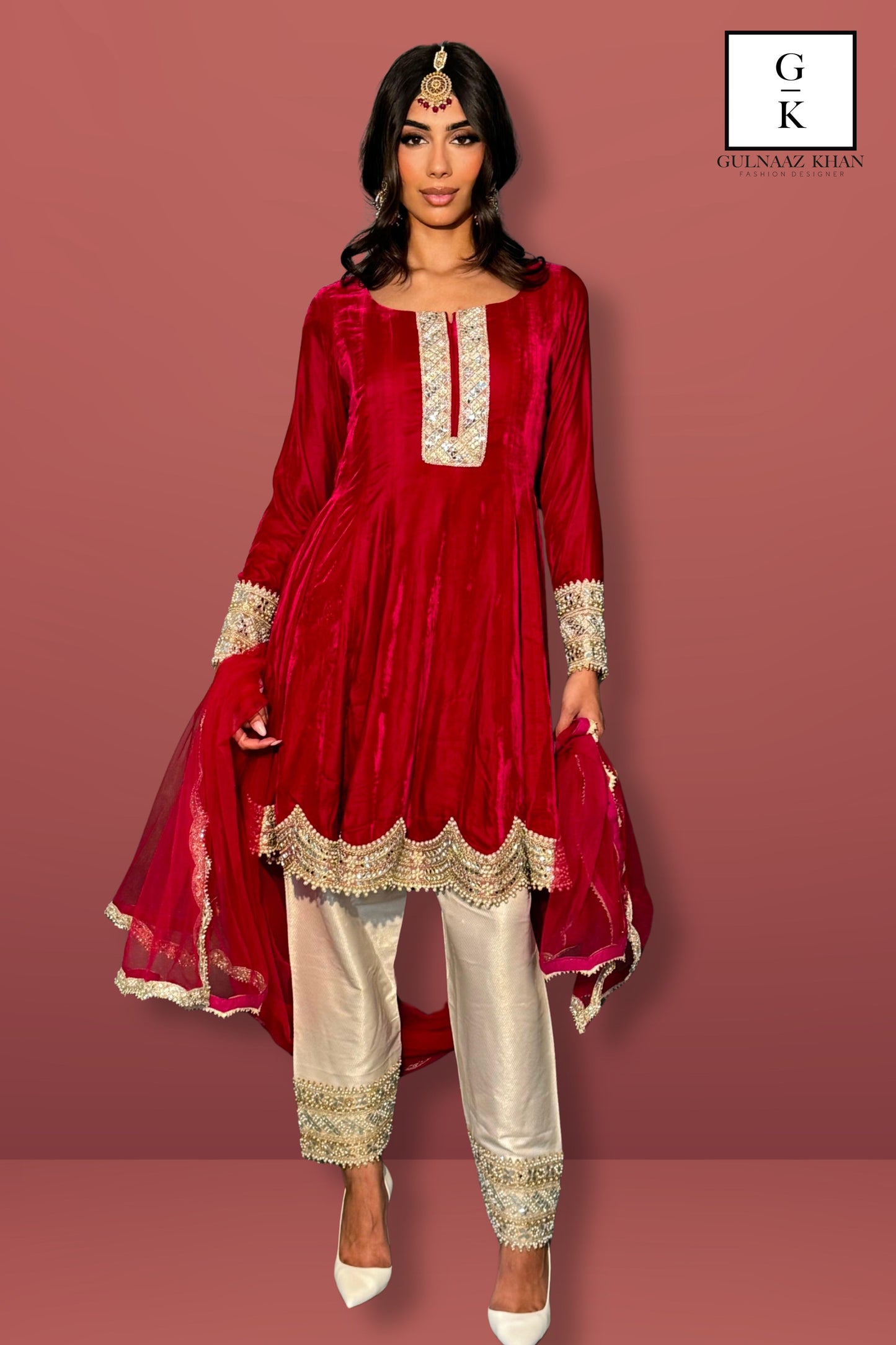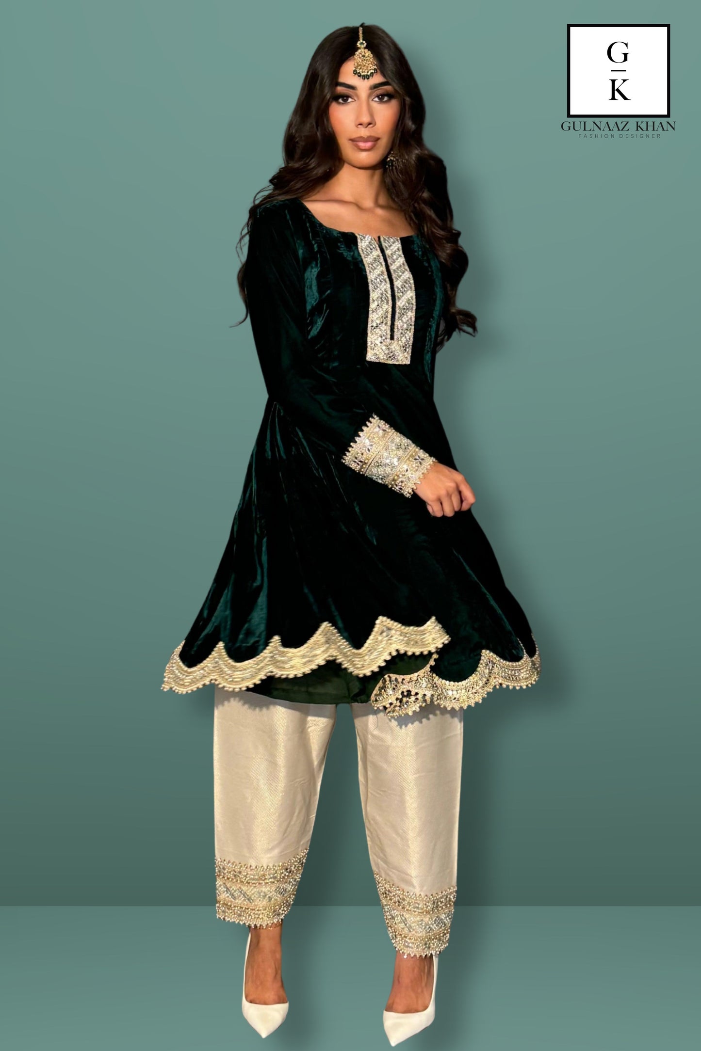 Regular price $186.00 USDThis stunning traditional outfit features a rich green velvet kameez adorned with intricate gold embroidery. The kameez has a classic neckline embellished with detailed gold work, extending down the front for a luxurious touch. The full-length sleeves are also highlighted with delicate gold embroidery, adding to the regal look.The ensemble includes matching green net dupatta with golden borders, perfectly complementing the kameez. The outfit is paired with contrasting cream silk trousers, detailed with gold embroidery at the cuffs, enhancing the overall elegance.Ideal for festive occasions, weddings, and special celebrations, this outfit combines traditional craftsmanship with modern elegance.