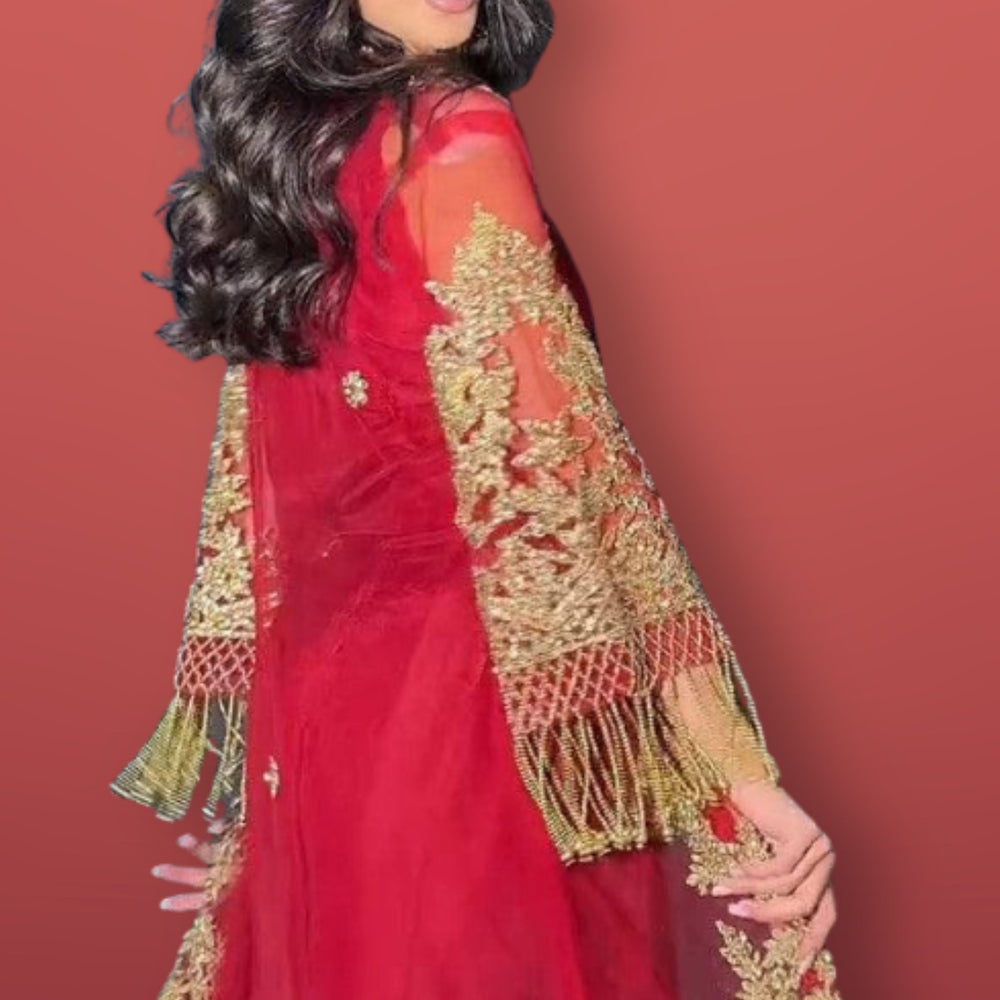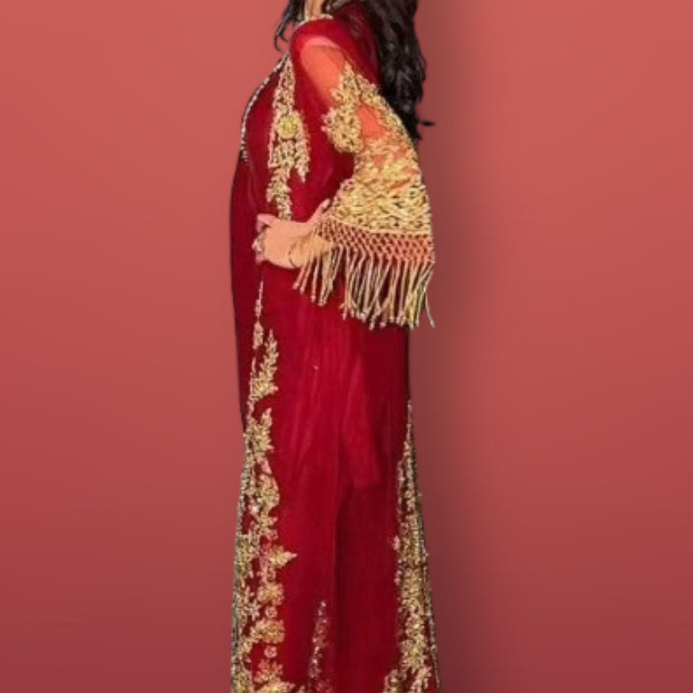 Impress everyone with your stunning traditional look by wearing this beautiful heavily embroidered long jacket with danglers on sleeves. Paired with a shirt kurta and embroidered pant zardozi work on this dress will give you a different yet classy look. Paired this dress with minimal jewelry and heels to enhance the look.