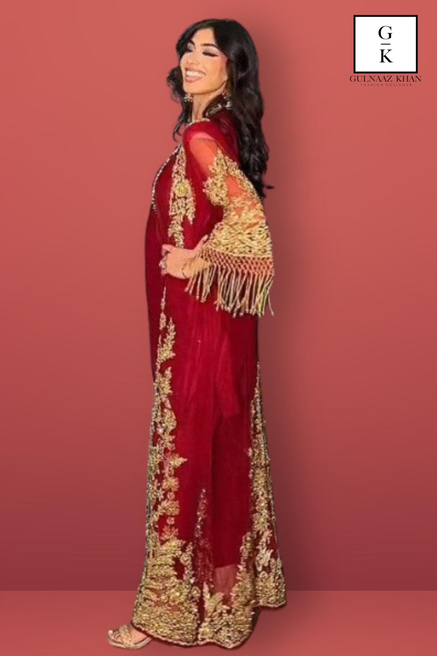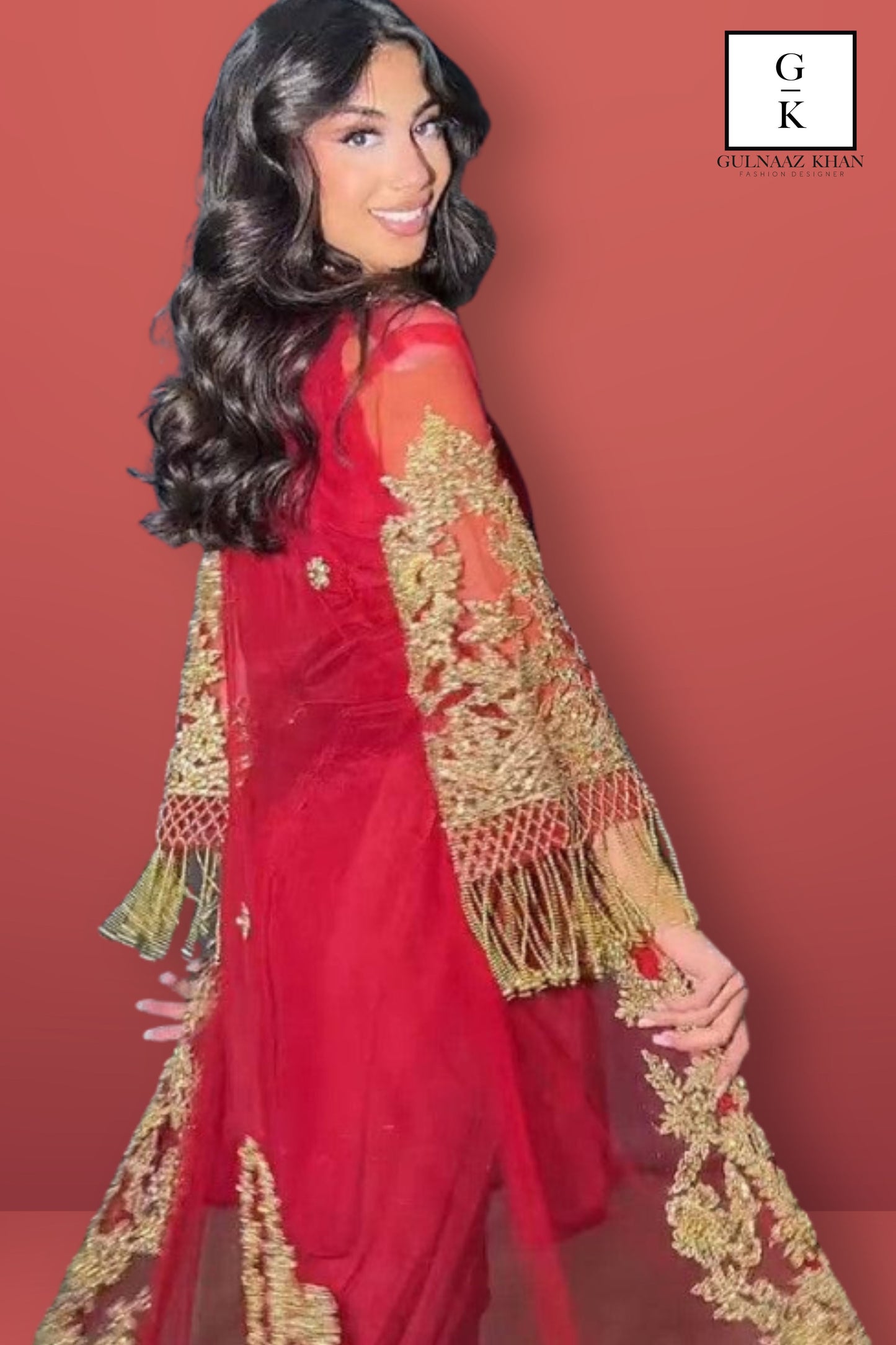 Regular price $493.50 USDImpress everyone with your stunning traditional look by wearing this beautiful heavily embroidered long jacket with danglers on sleeves. Paired with a shirt kurta and embroidered pant zardozi work on this dress will give you a different yet classy look. Paired this dress with minimal jewelry and heels to enhance the look.