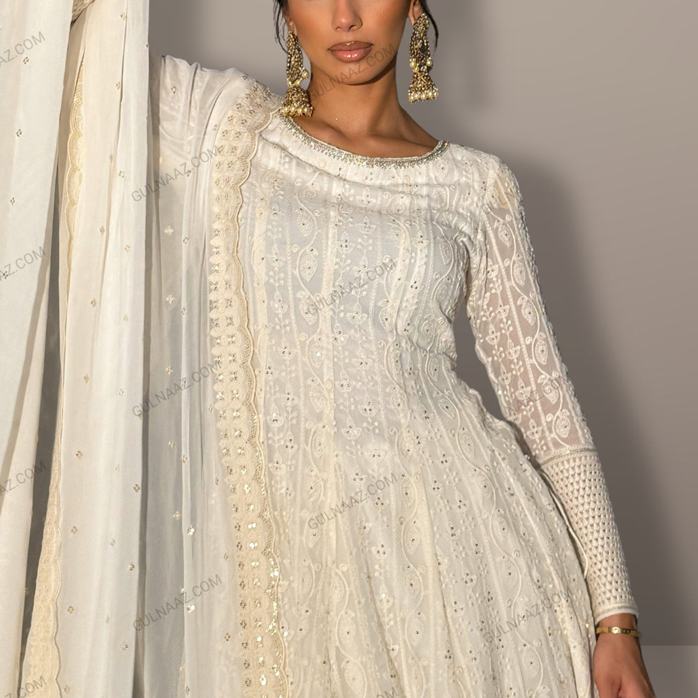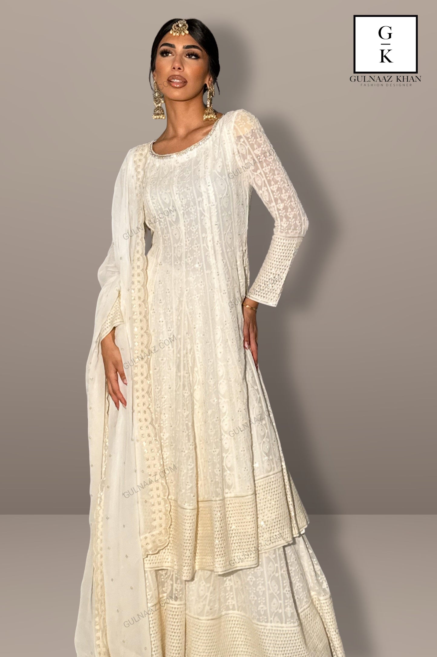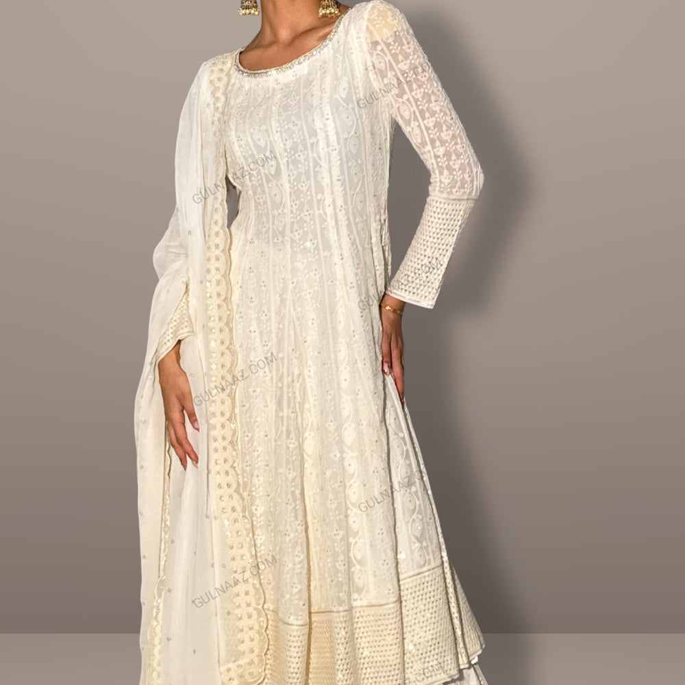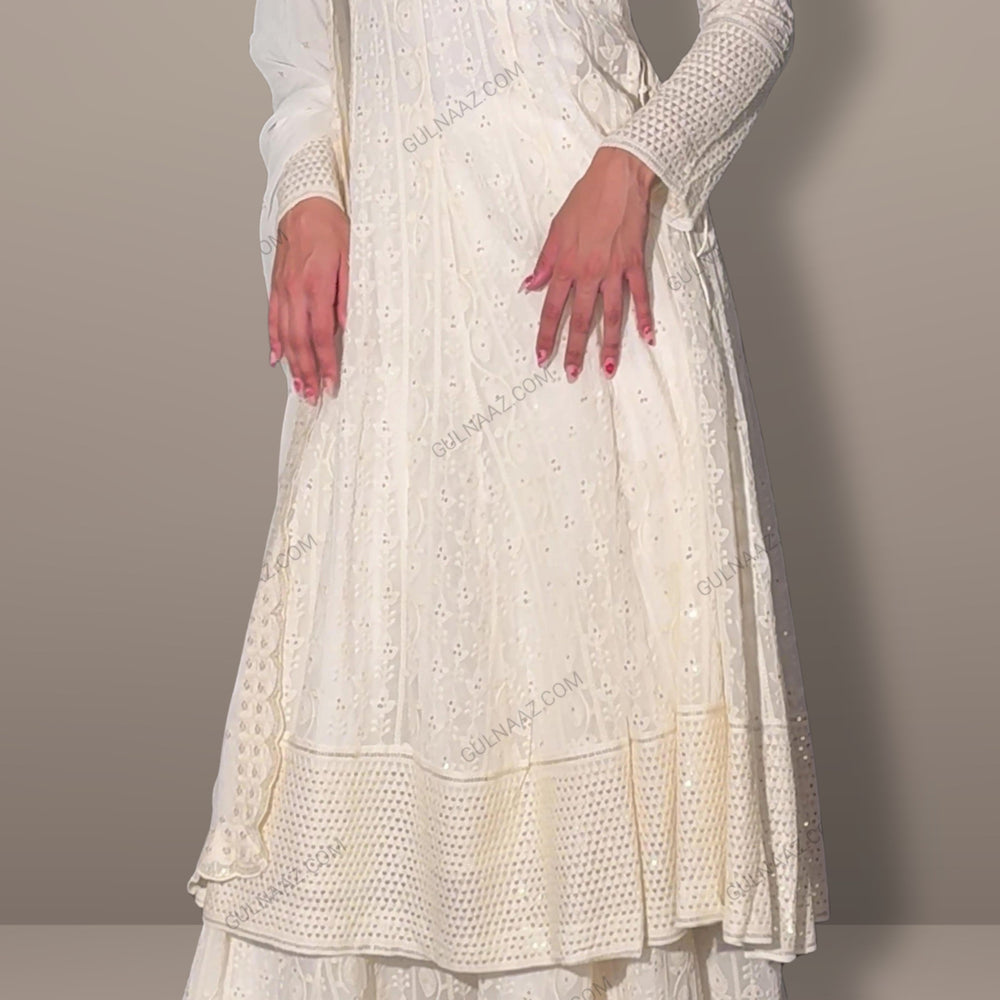 Elevate your style with our exquisite Chikankari ensemble, meticulously crafted from luxurious georgette material. The top features a stunning Nayra cut pattern adorned with intricate, heavy Chikankari embroidery that extends across the entire surface. Complementing the top, the beautifully embroidered, flared palazzo adds a touch of elegance and grace. The matching georgette dupatta, with delicate embroidery along the borders, completes the ensemble, making it perfect for special occasions. This outfit seamlessly blends traditional craftsmanship with contemporary design, creating a timeless addition to your wardrobe.