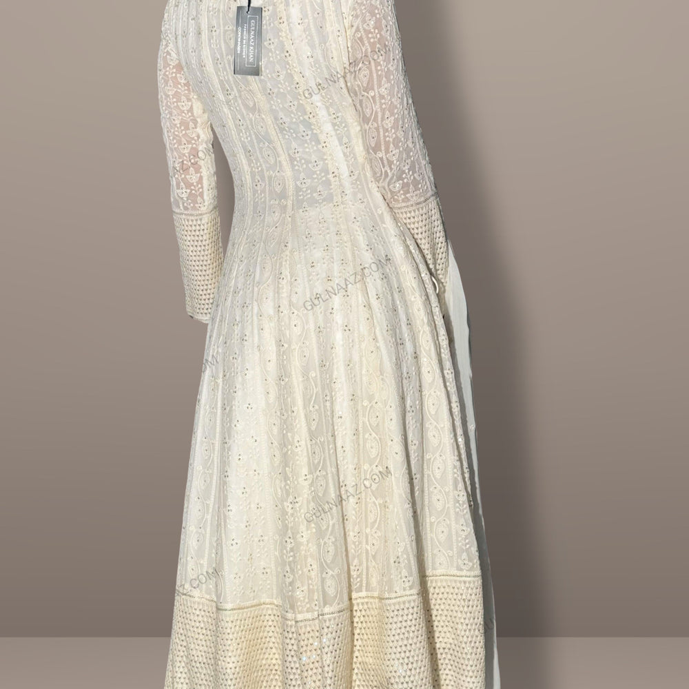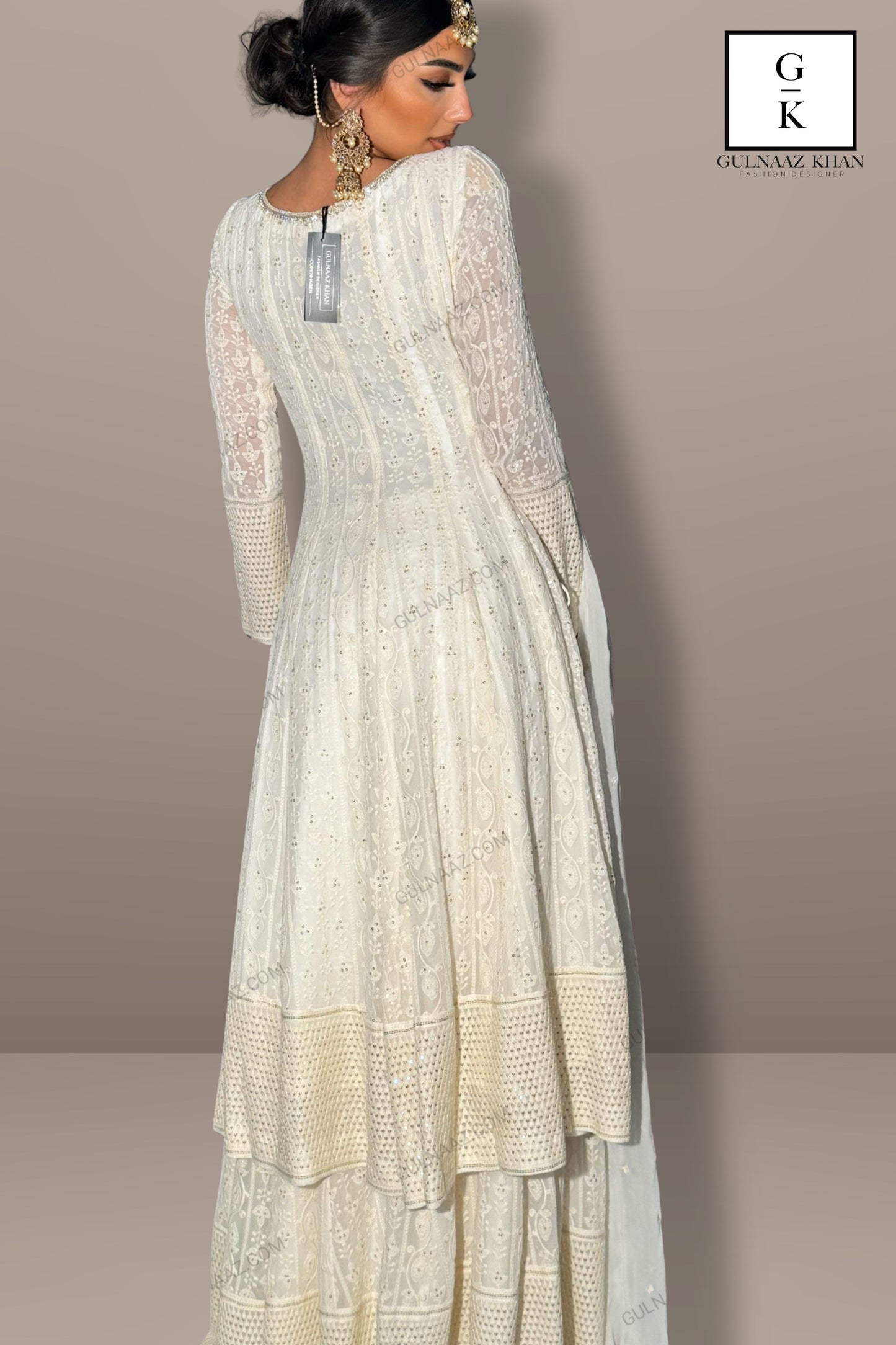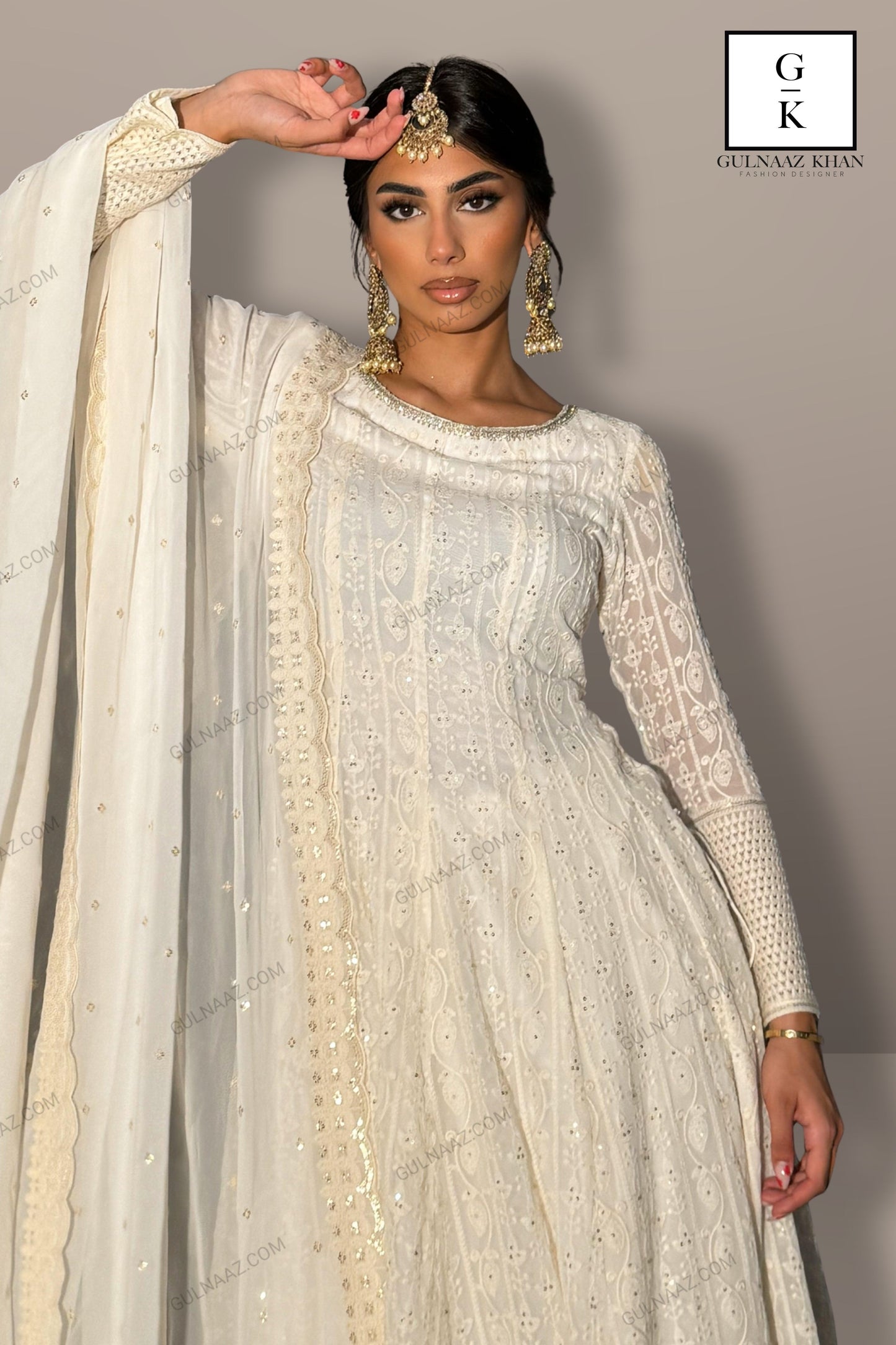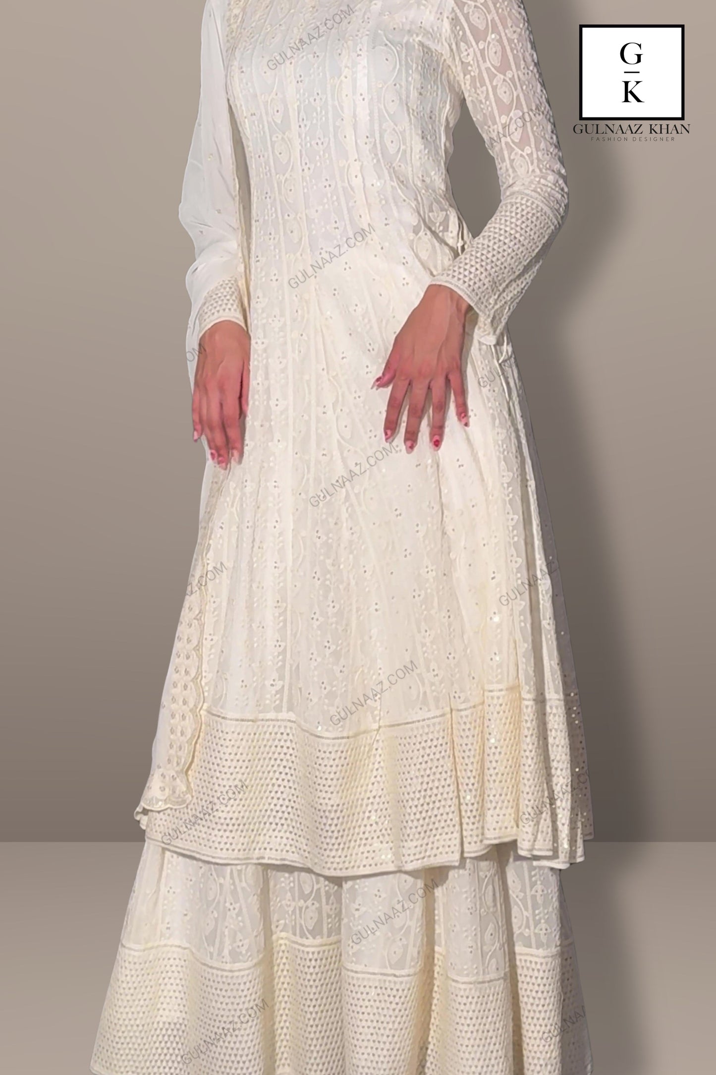 Elevate your style with our exquisite Chikankari ensemble, meticulously crafted from luxurious georgette material. The top features a stunning Nayra cut pattern adorned with intricate, heavy Chikankari embroidery that extends across the entire surface. Complementing the top, the beautifully embroidered, flared palazzo adds a touch of elegance and grace. The matching georgette dupatta, with delicate embroidery along the borders, completes the ensemble, making it perfect for special occasions. This outfit seamlessly blends traditional craftsmanship with contemporary design, creating a timeless addition to your wardrobe.