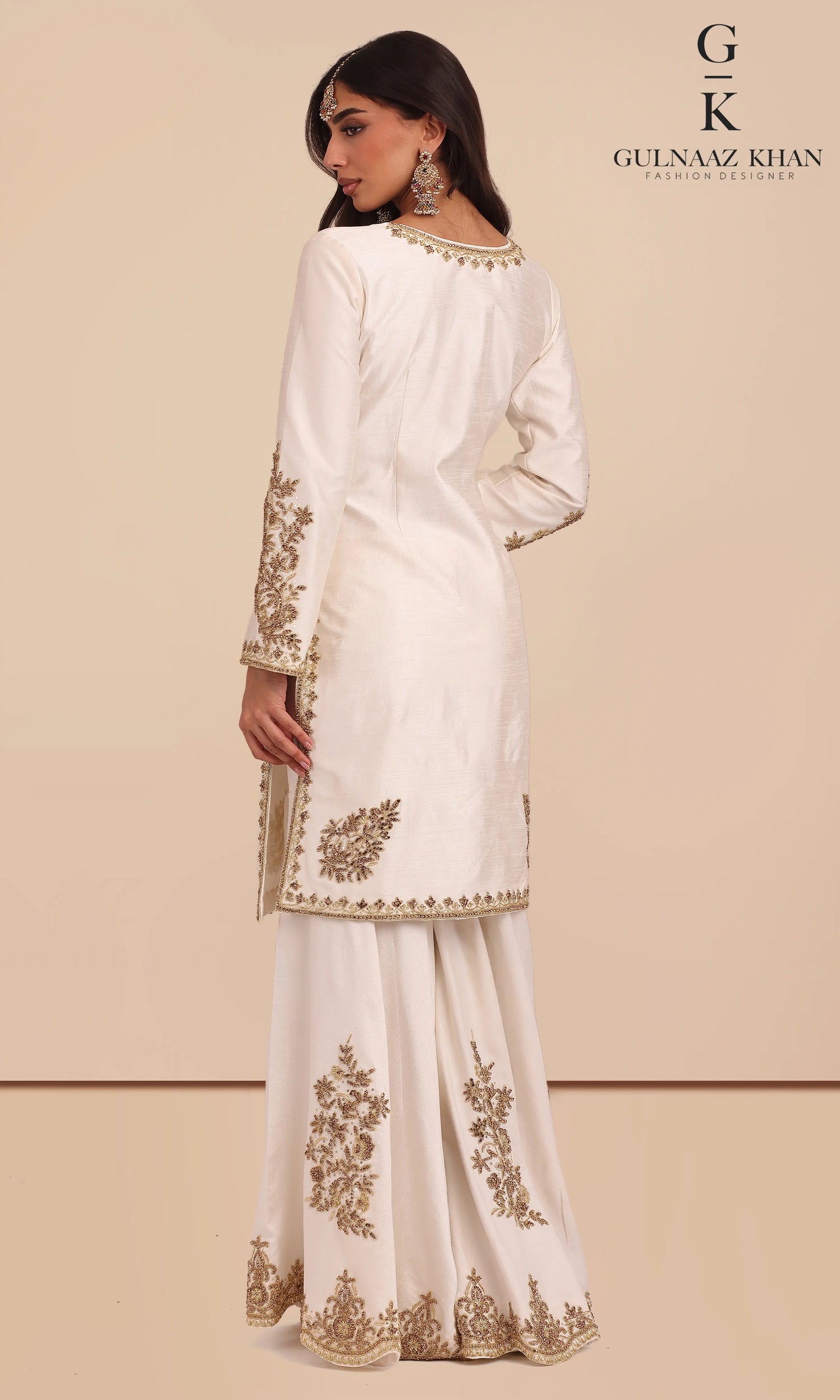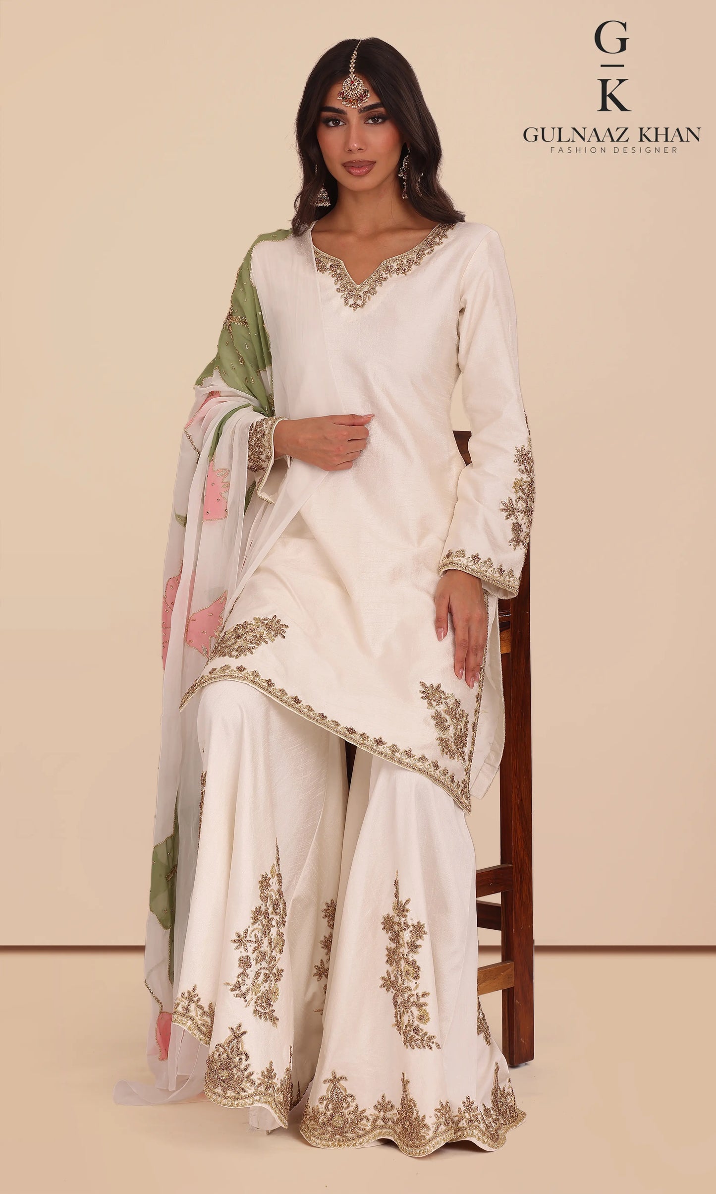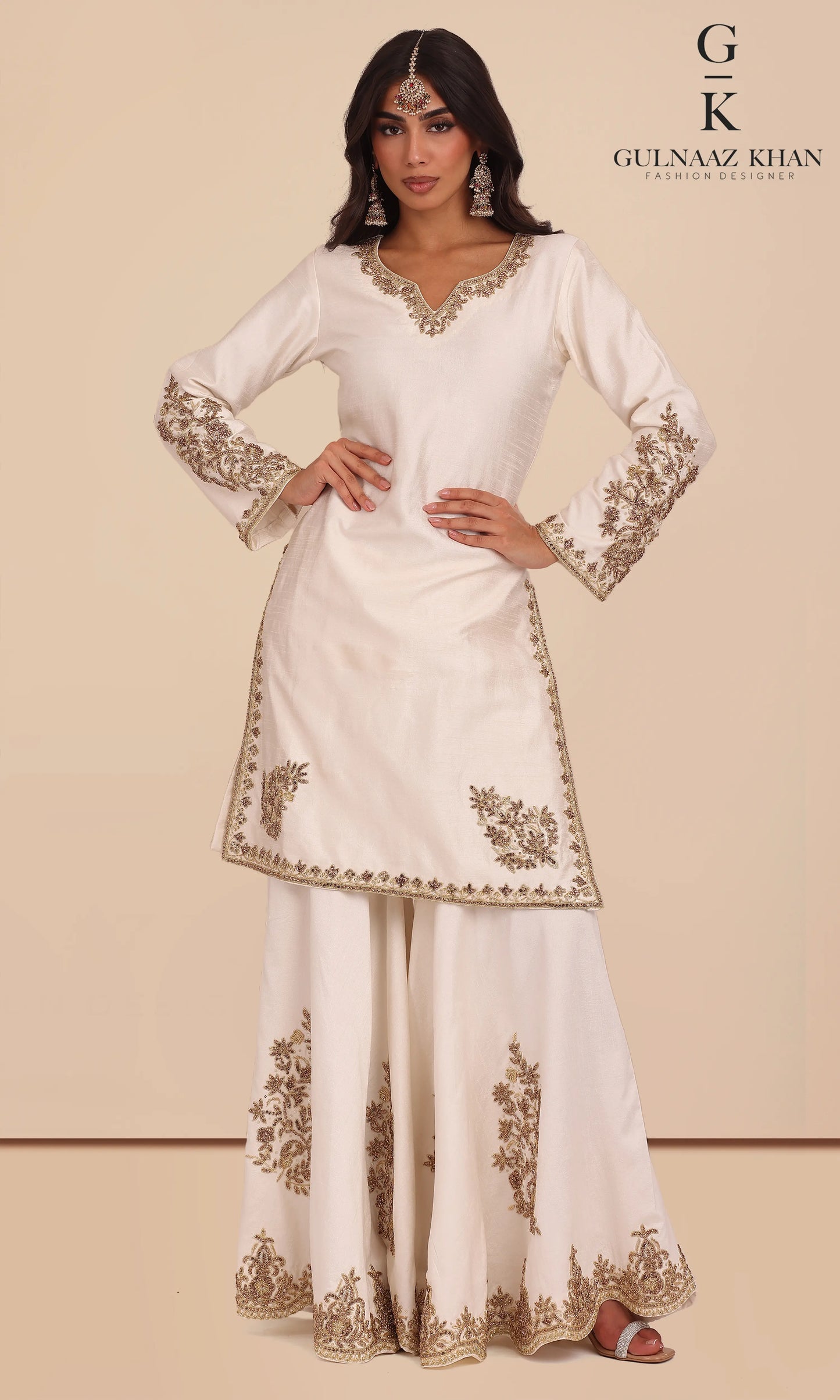 A stunning off-white designer ensemble by Gulnaaz Khan, crafted from luxurious fabric with intricate gold and pearl embroidery. The set features a classic long kurta with elegant detailing along the neckline and sleeves, paired with a flowy, wide-leg sharara for a graceful silhouette.