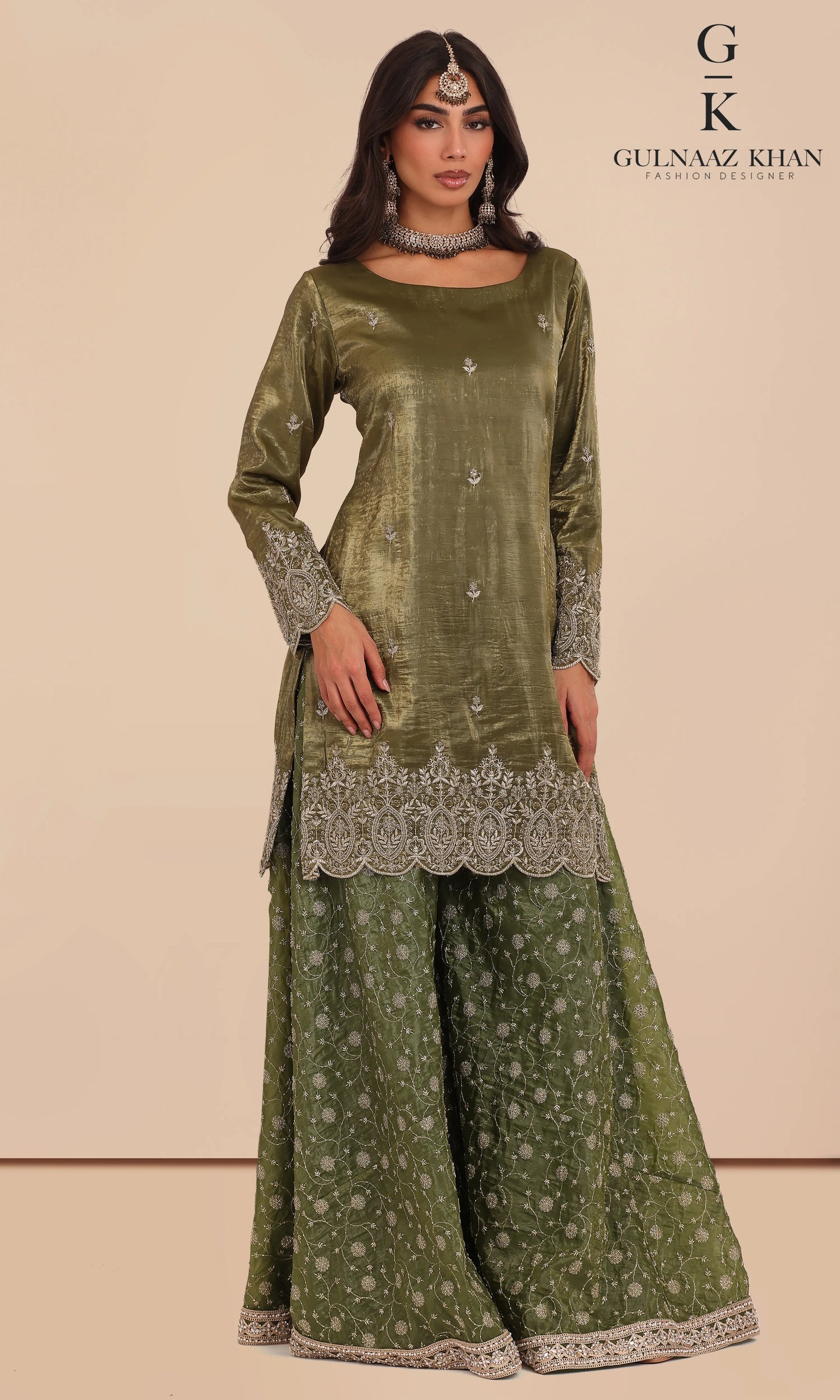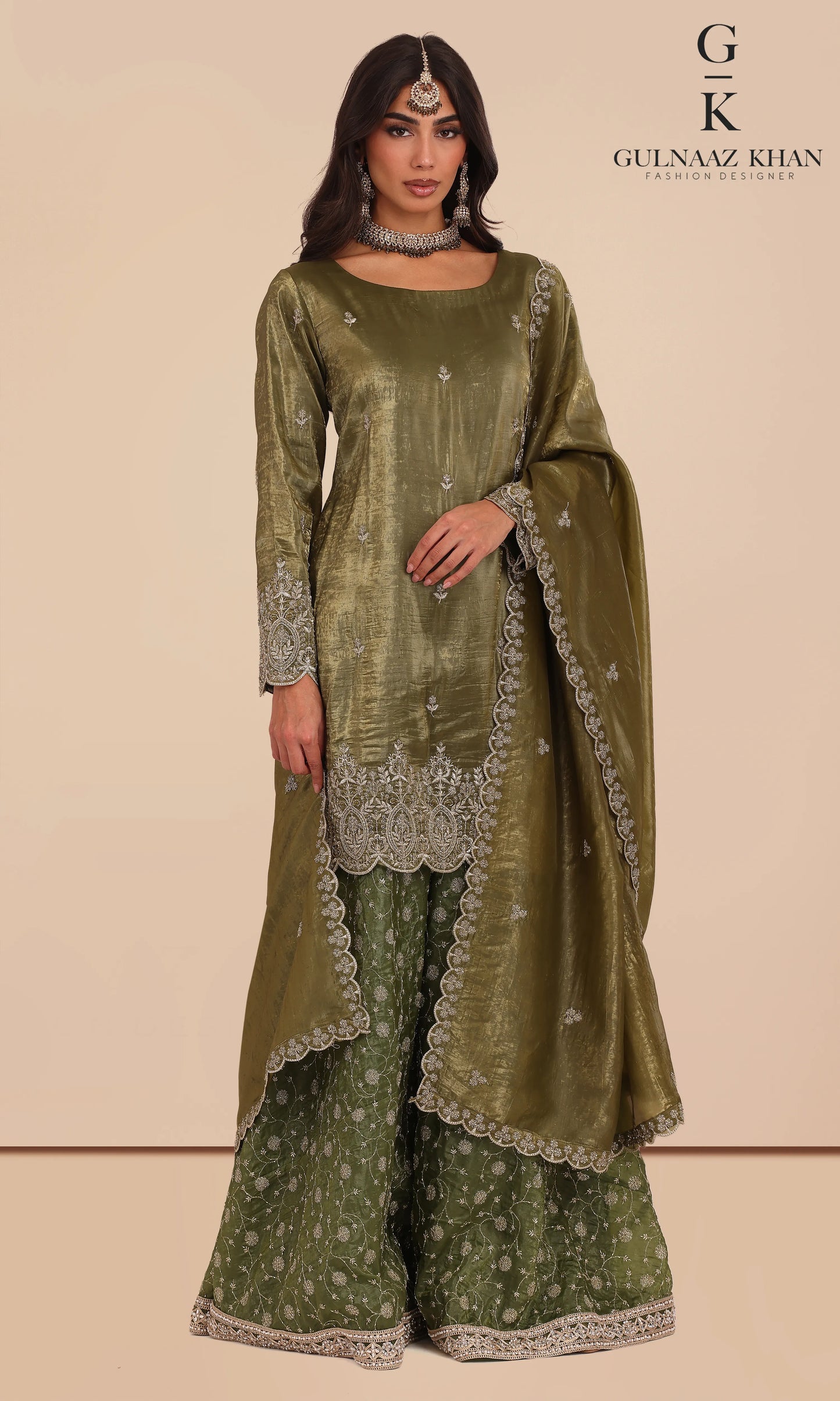 Mira – Designer Olive Green Tissue Silk Sharara Set