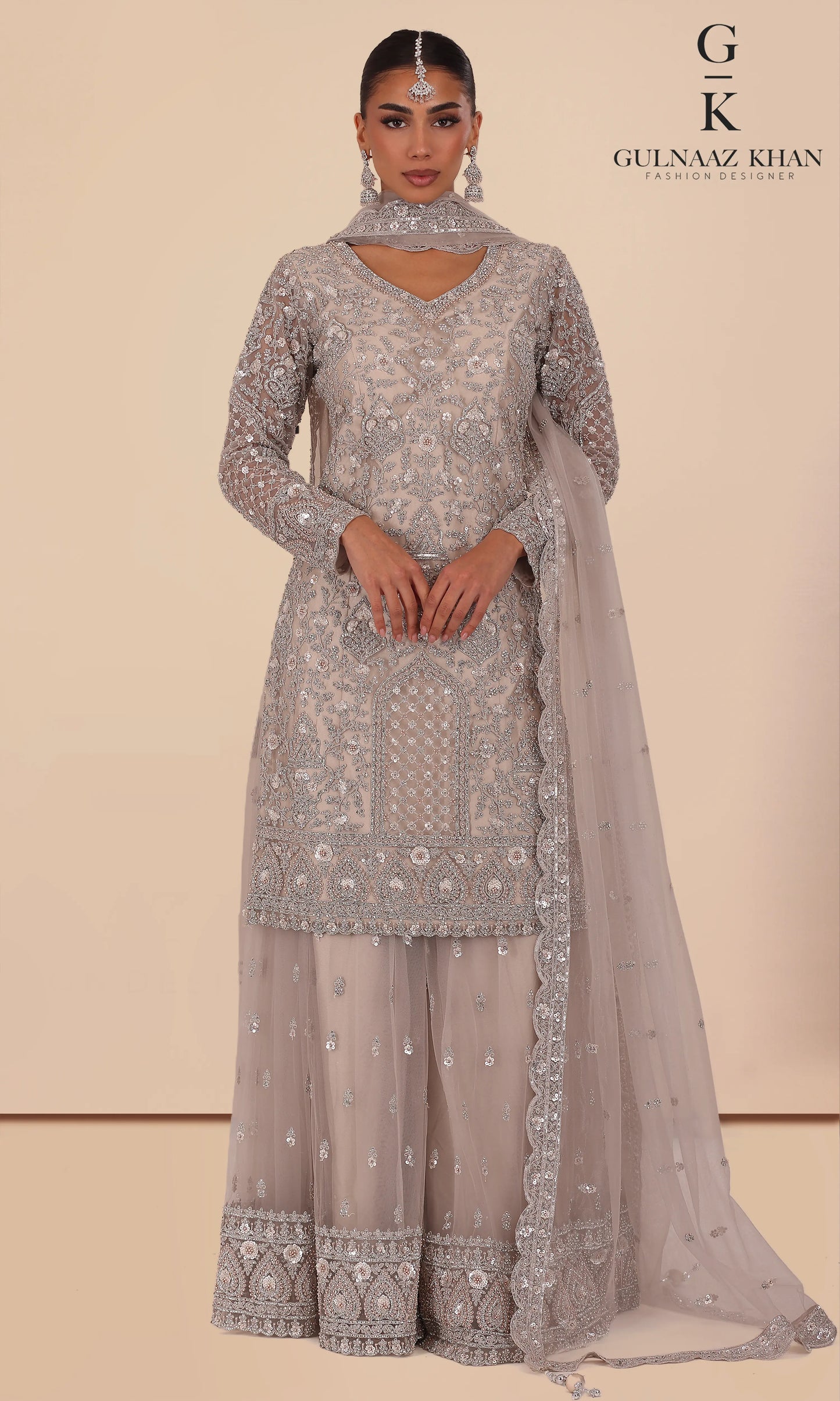 A timeless designer sharara set crafted in pure silk and net, featuring intricate hand embroidery and paired with a delicate net dupatta — perfect for weddings and formal occasions.