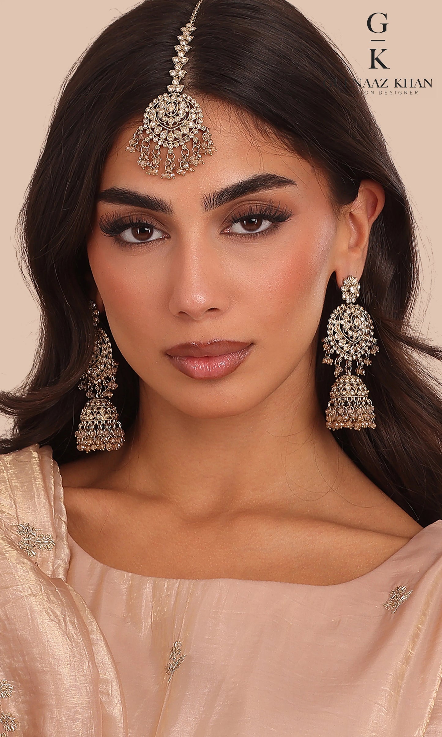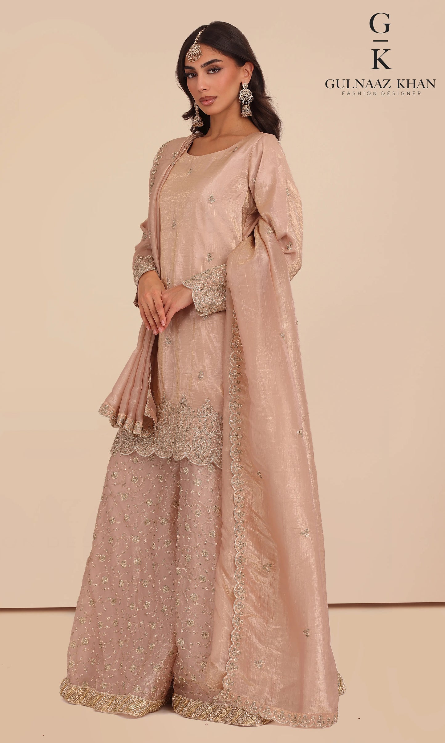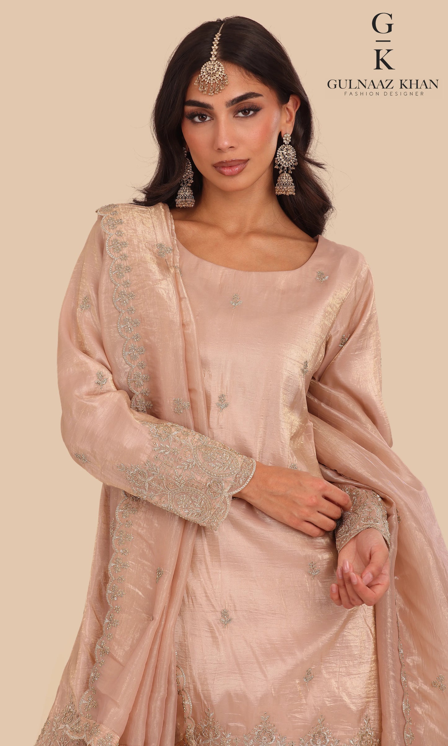 Mira in peach is a refined sharara set crafted in luxurious tissue silk. Featuring delicate embroidery with zari and subtle stone accents, this outfit offers a graceful festive look. Paired with a flowy sharara and matching embroidered dupatta, it’s perfect for wedding celebrations and elegant occasions.