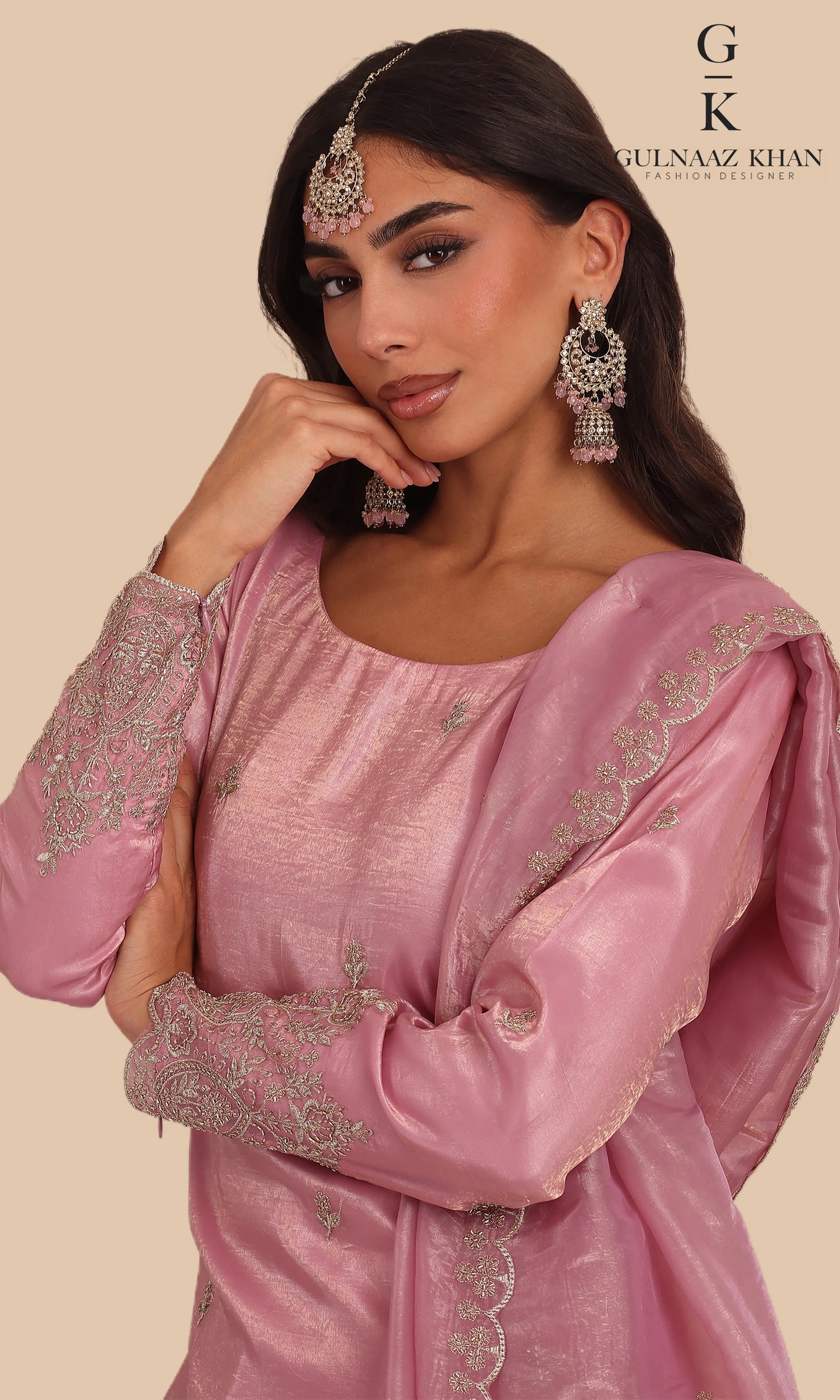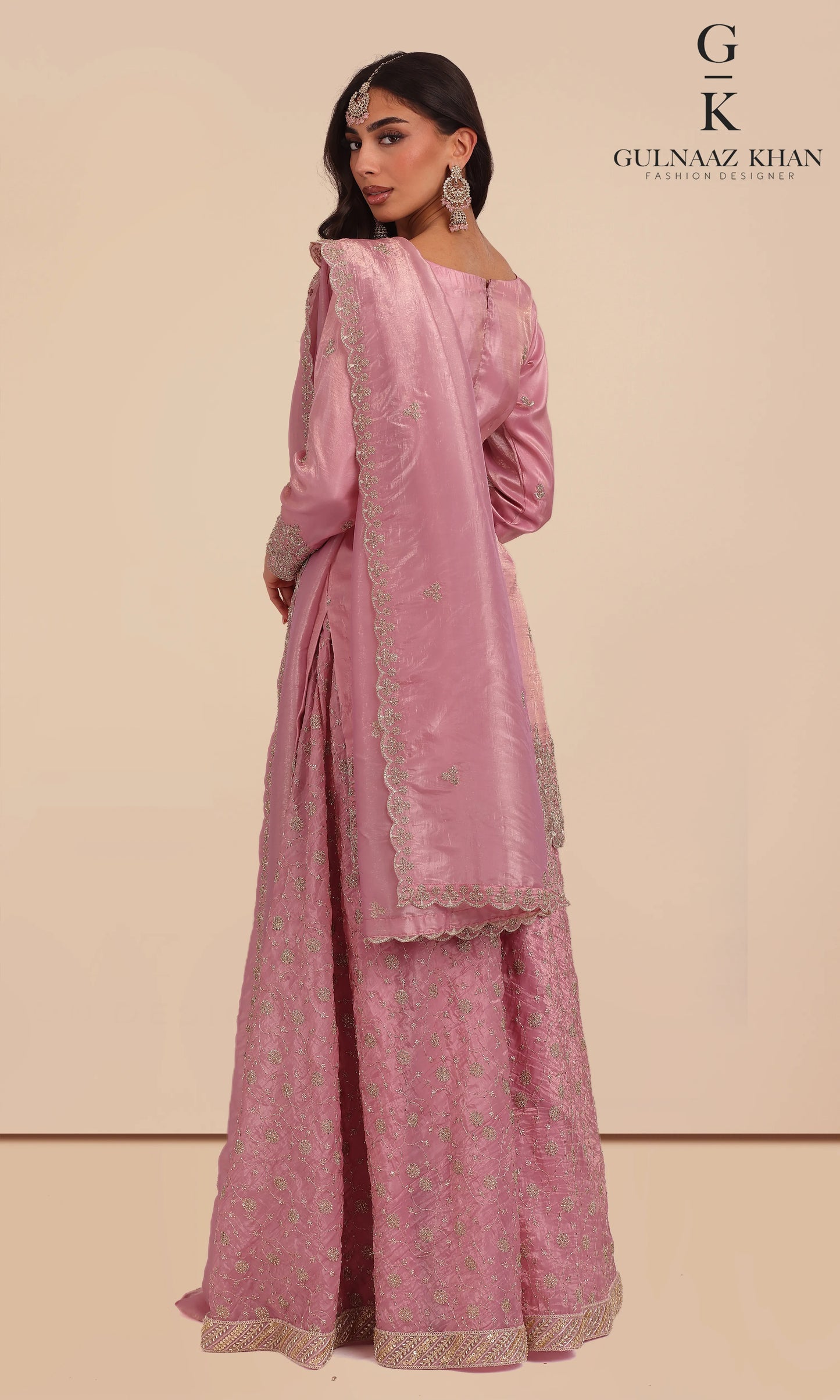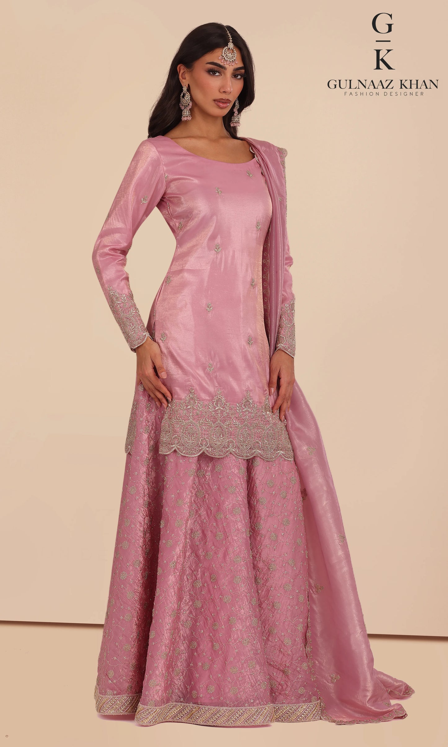 Mira in pink is a graceful sharara set crafted in tissue silk, designed for refined festive occasions. The outfit features delicate embroidery with subtle zari and stone accents, paired with a flowing sharara and a matching embroidered dupatta. A timeless choice for wedding celebrations and elegant gatherings.