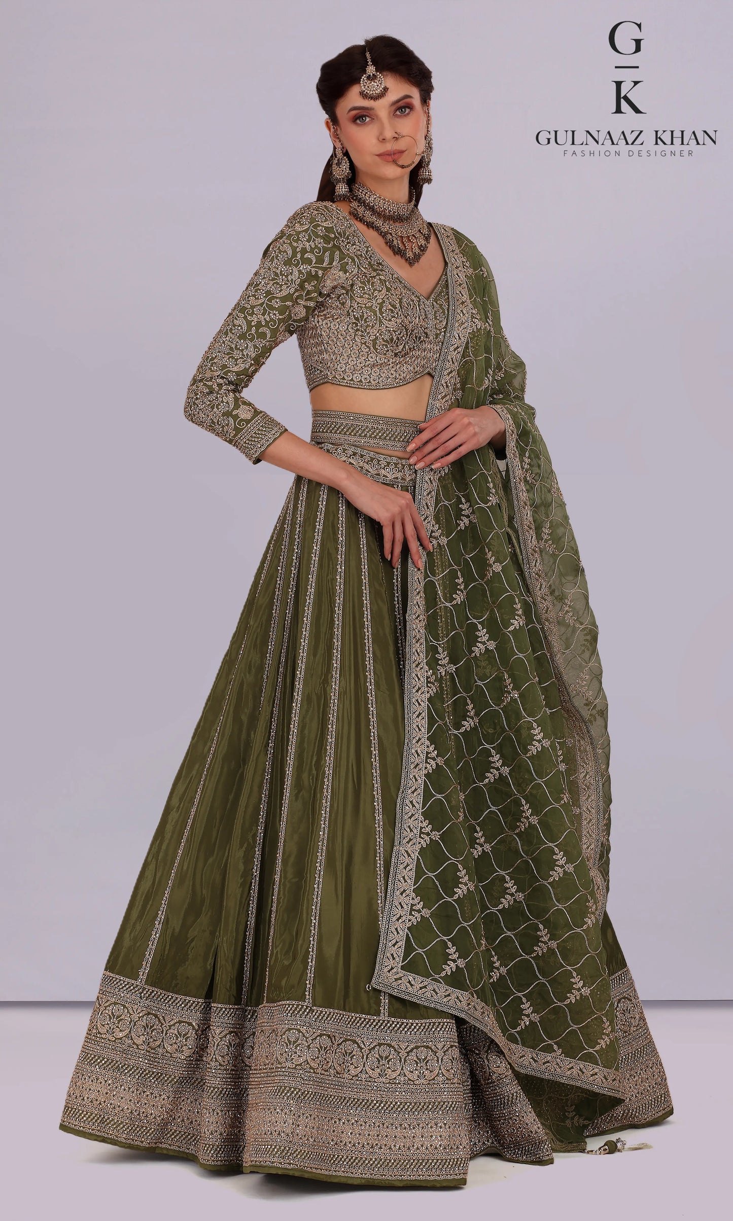 Saira – Designer Olive Green Crepe Lehenga for Haldi & Mehendi
