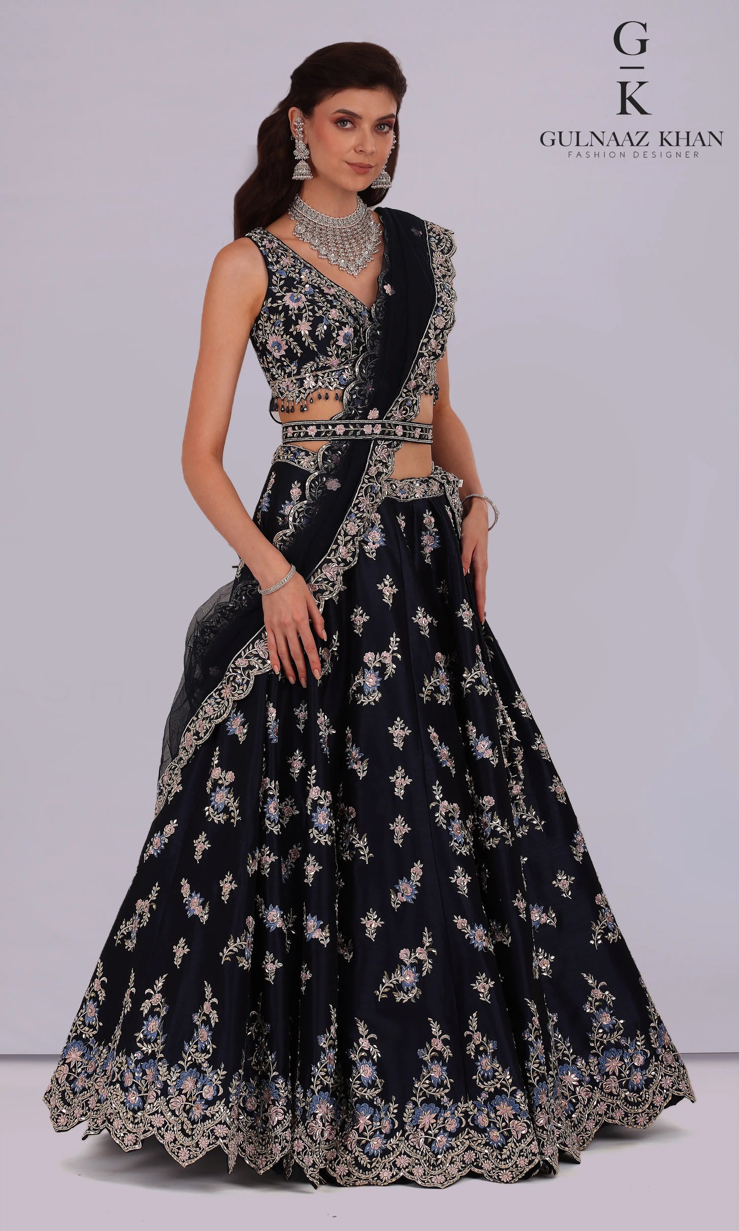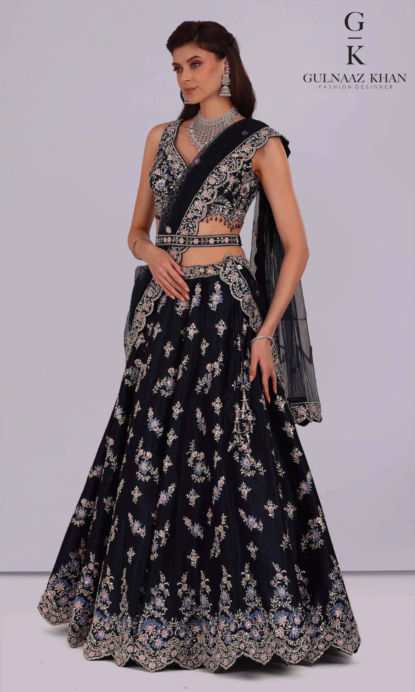 Ziyana Bridal Gown – Navy Blue Jacket Style Net & Raw Silk Dress with Sequins, Dori, Pearls & Stone Work