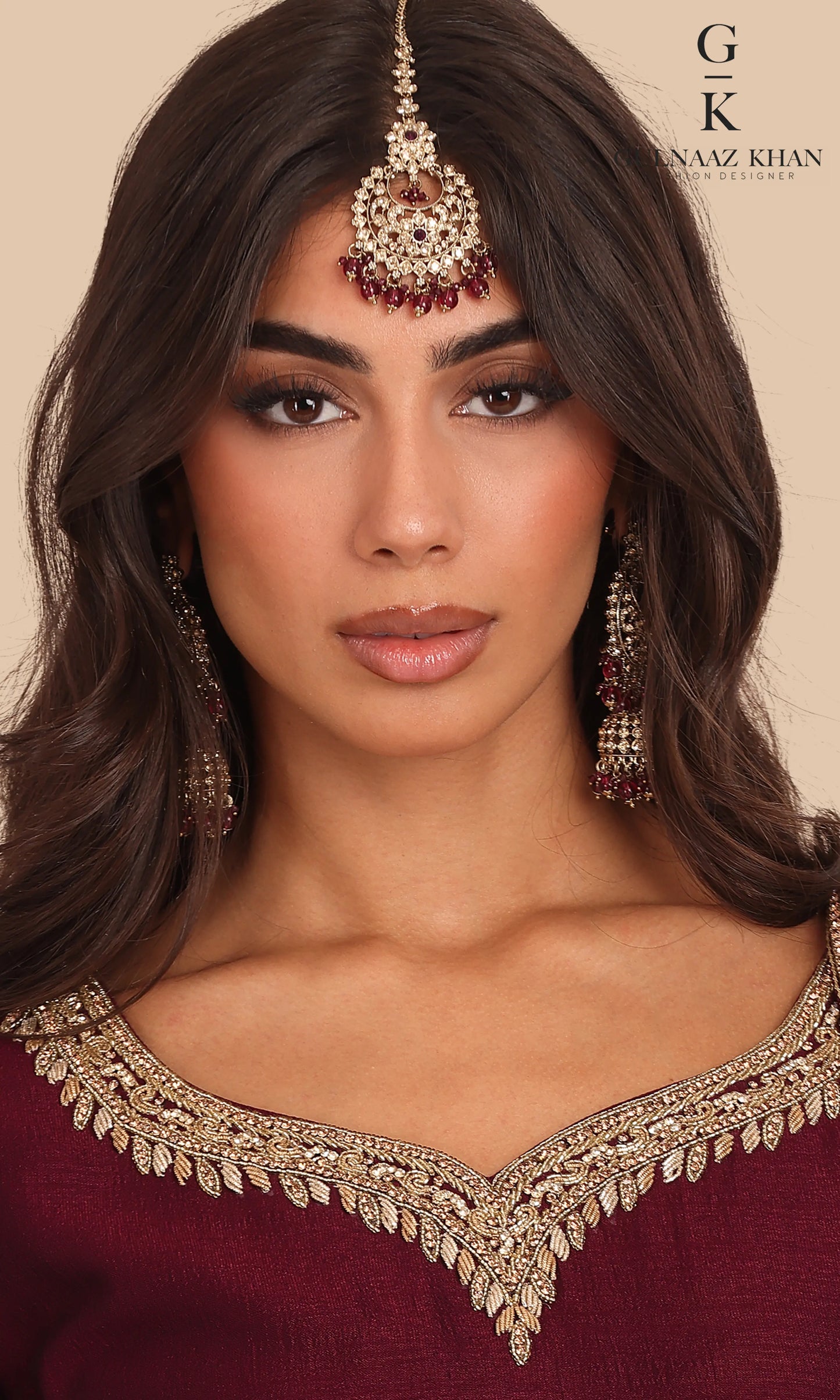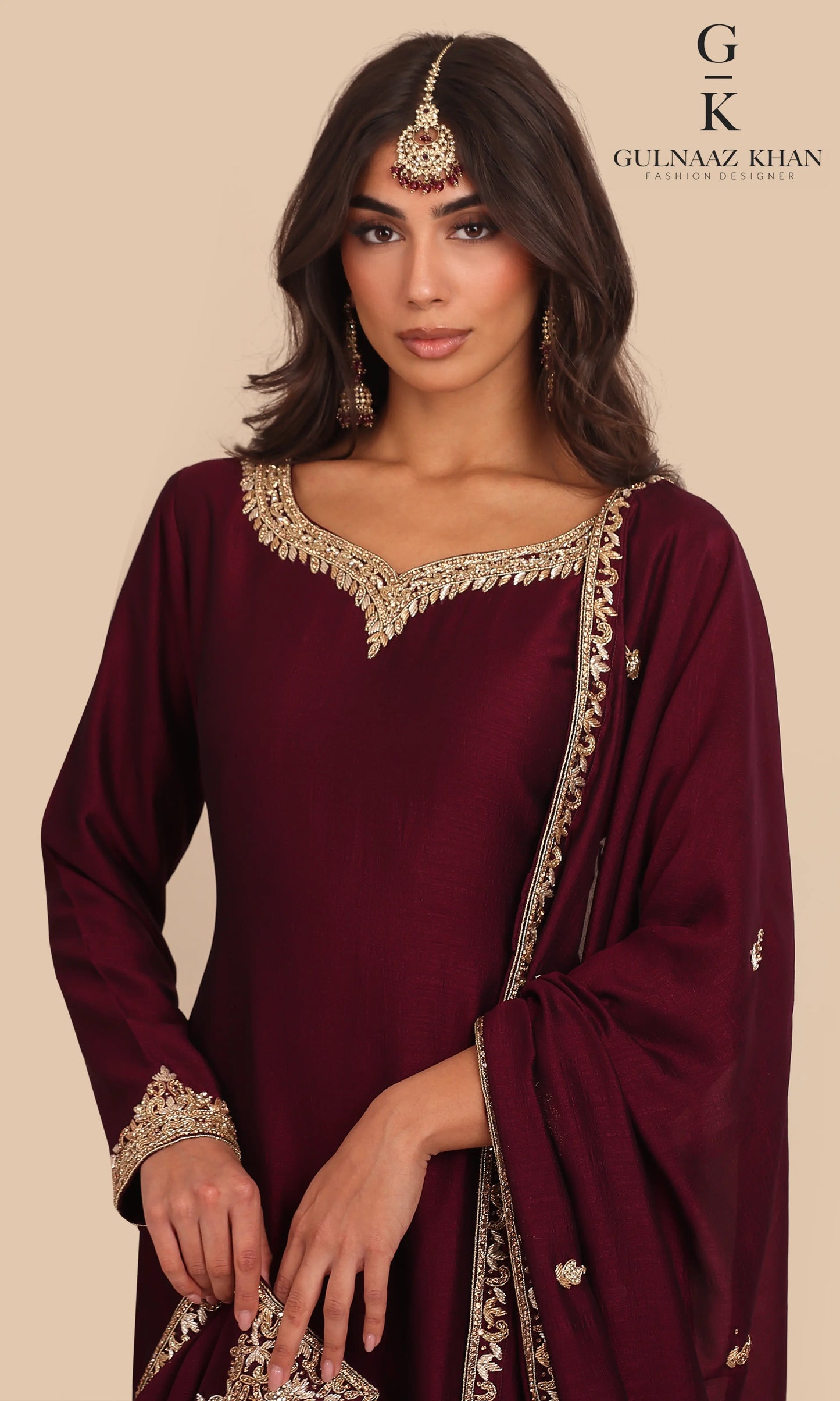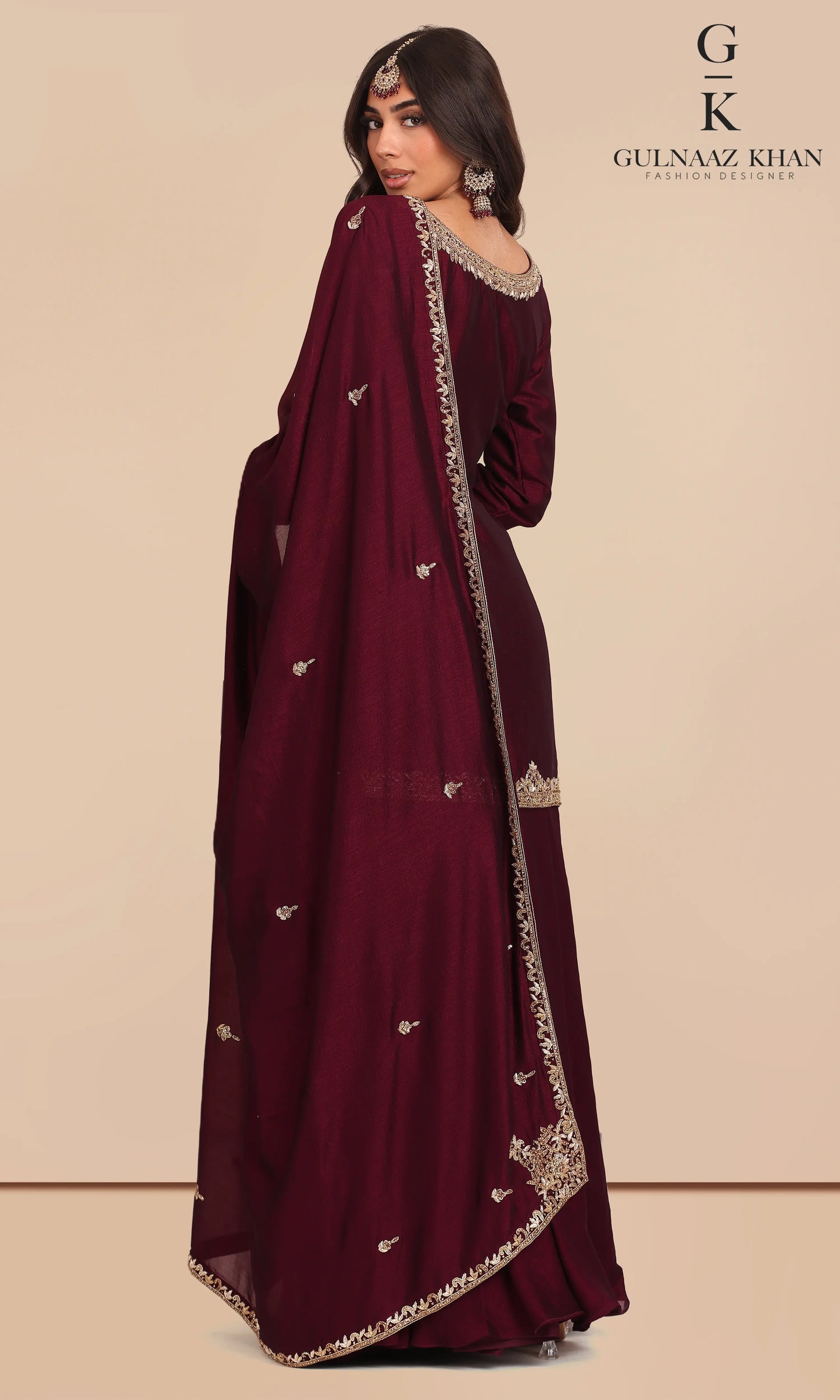 Farhat is a timeless sharara suit crafted in luxurious pure silk, designed for festive and wedding occasions. The outfit features elegant handwork with stone, nakshi, and dabka embroidery, creating a rich traditional look with subtle sparkle. Paired with a flowy sharara and matching dupatta, this ensemble blends classic craftsmanship with modern elegance—perfect for weddings, receptions, and festive celebrations.