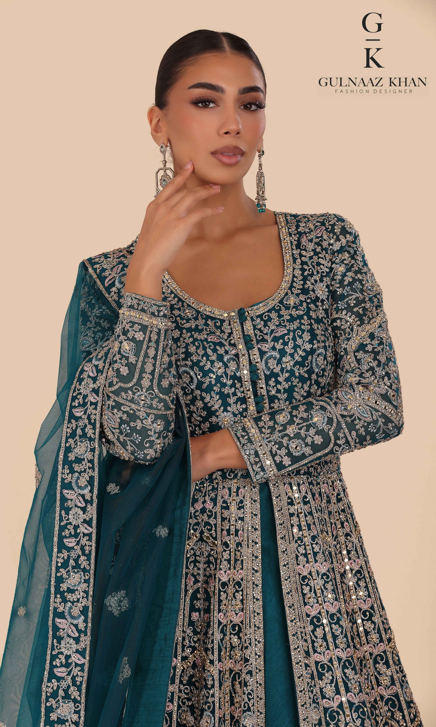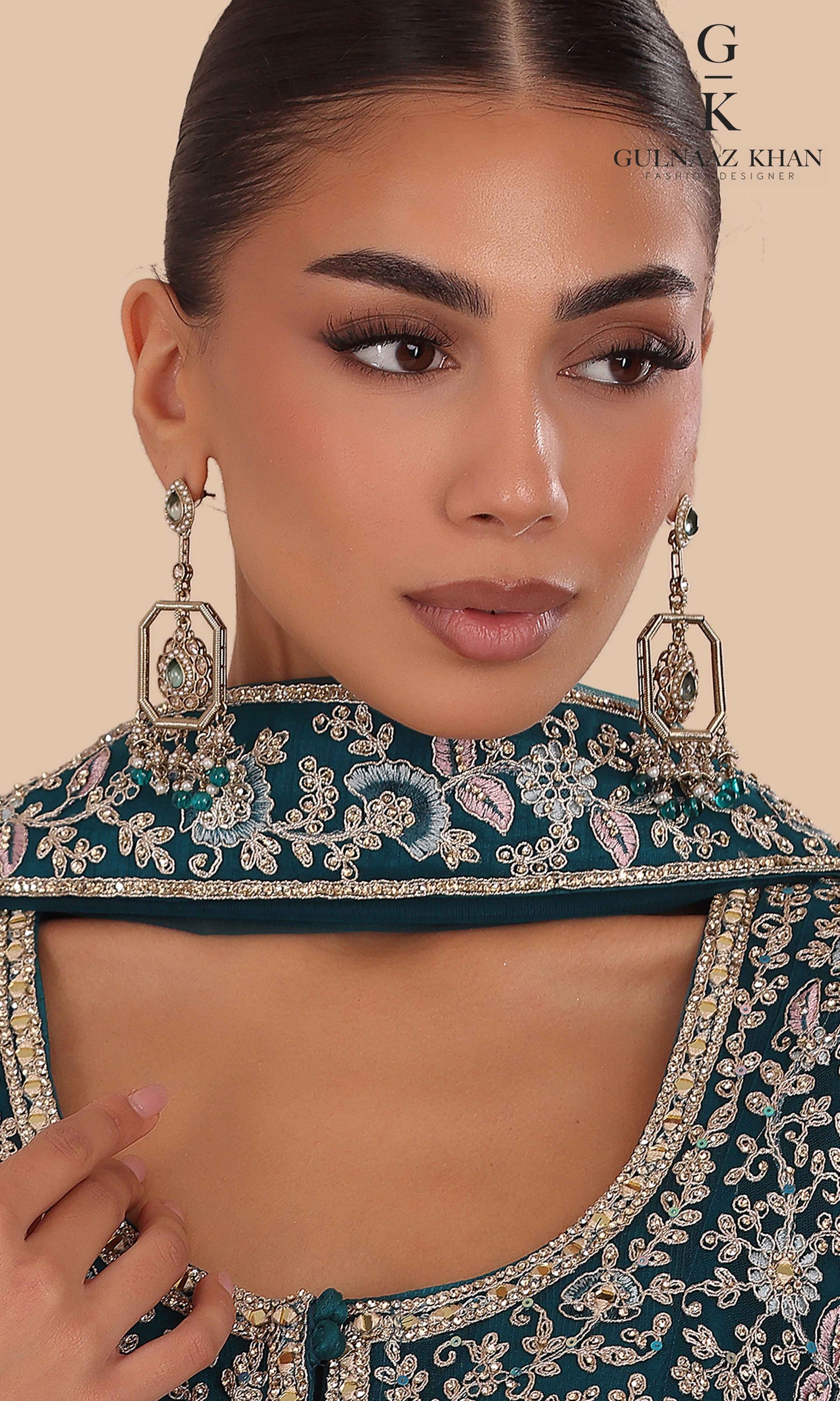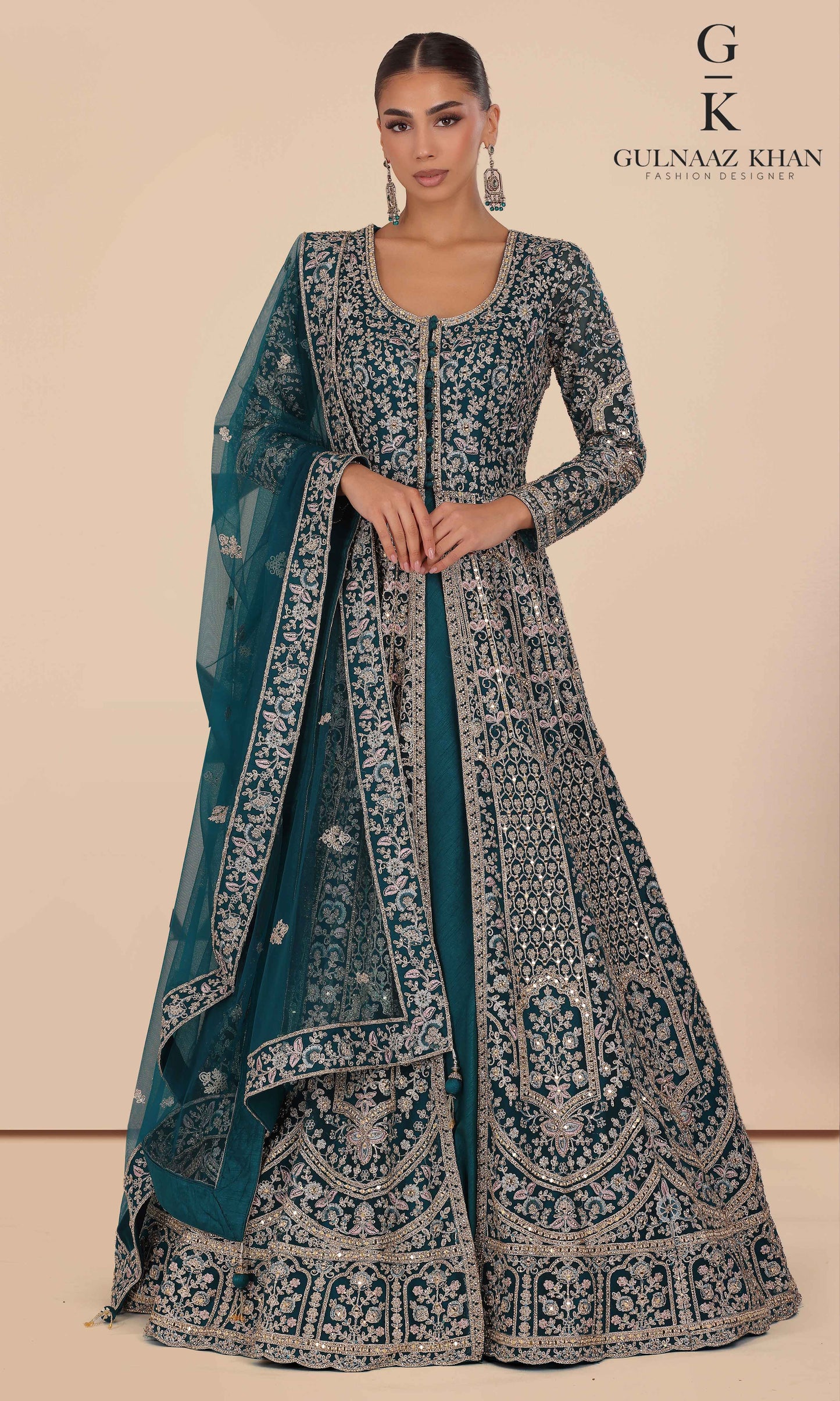Sabeen is a statement bridal gown designed with a delicately embroidered net jacket and a rich pure silk inner. Detailed with handcrafted dori work and shimmering zarkon stones, this outfit is perfect for brides who love elegance with a royal touch.