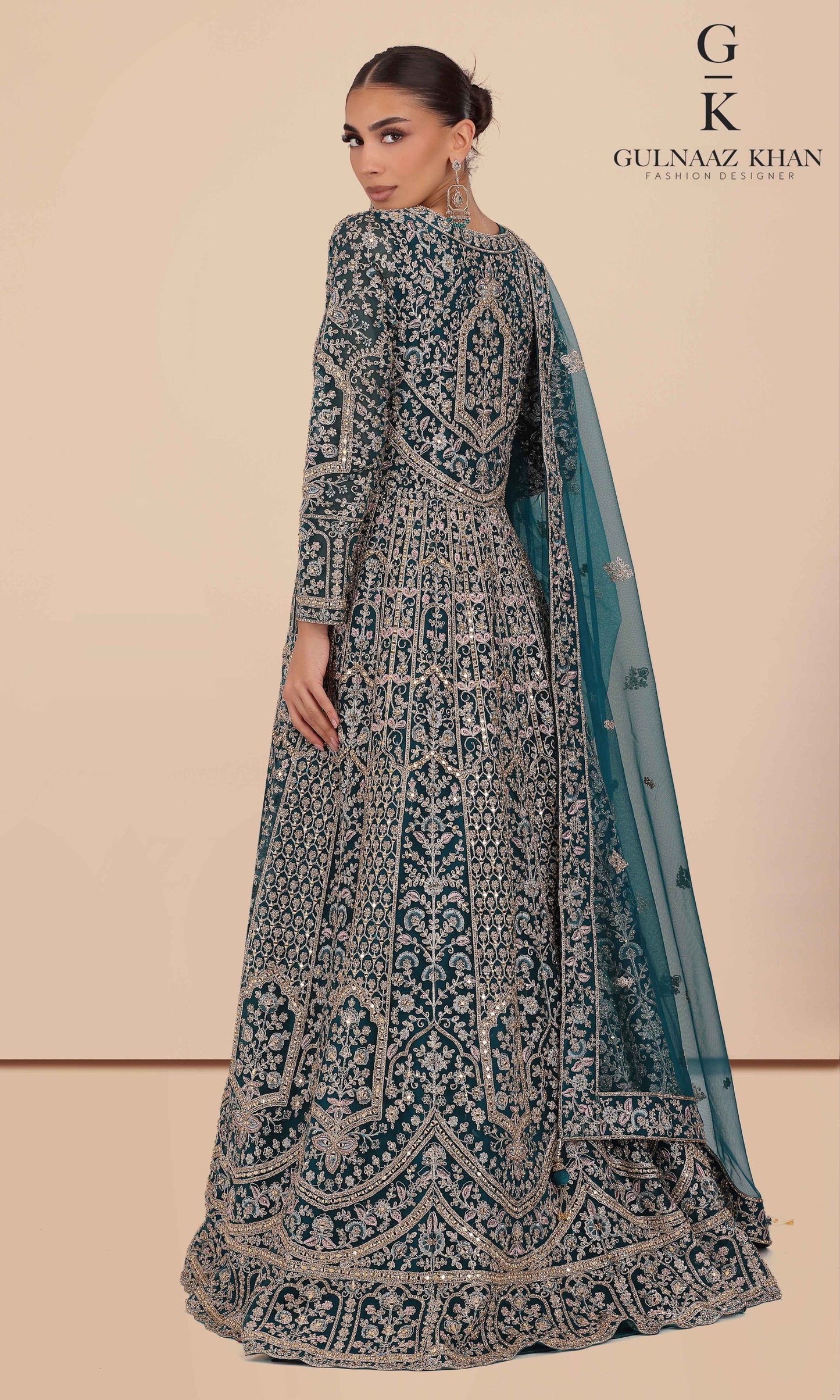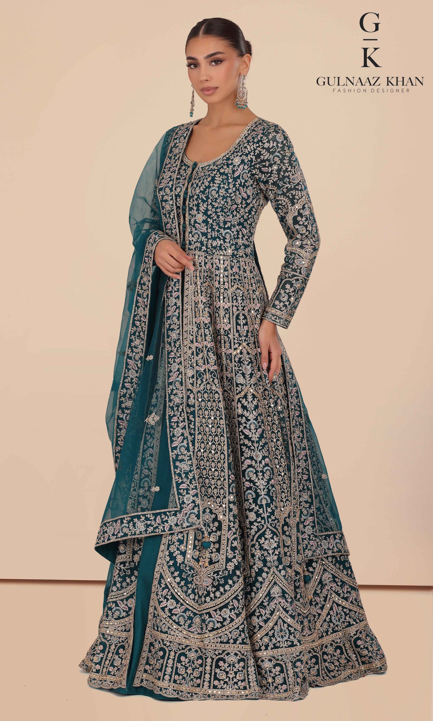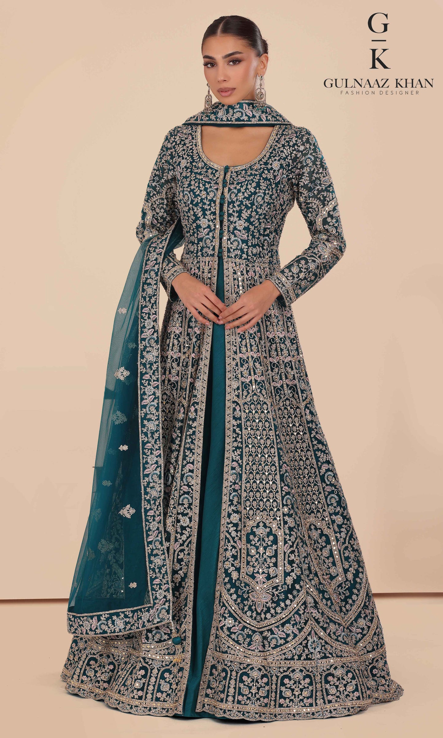 Sabeen is a statement bridal gown designed with a delicately embroidered net jacket and a rich pure silk inner. Detailed with handcrafted dori work and shimmering zarkon stones, this outfit is perfect for brides who love elegance with a royal touch.