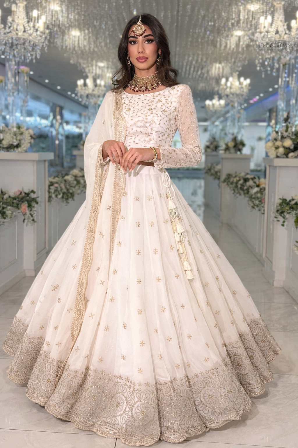 This stunning Pure raw silk lehenga set exudes elegance with its intricate zari embroidery and luxurious texture. The lehenga is adorned with delicate gold embellishments, creating a truly regal appeal. Paired with a matching dupatta featuring a finely detailed border, this ensemble is ideal for weddings, receptions, and festive occasions. A classic design that seamlessly combines tradition and grace