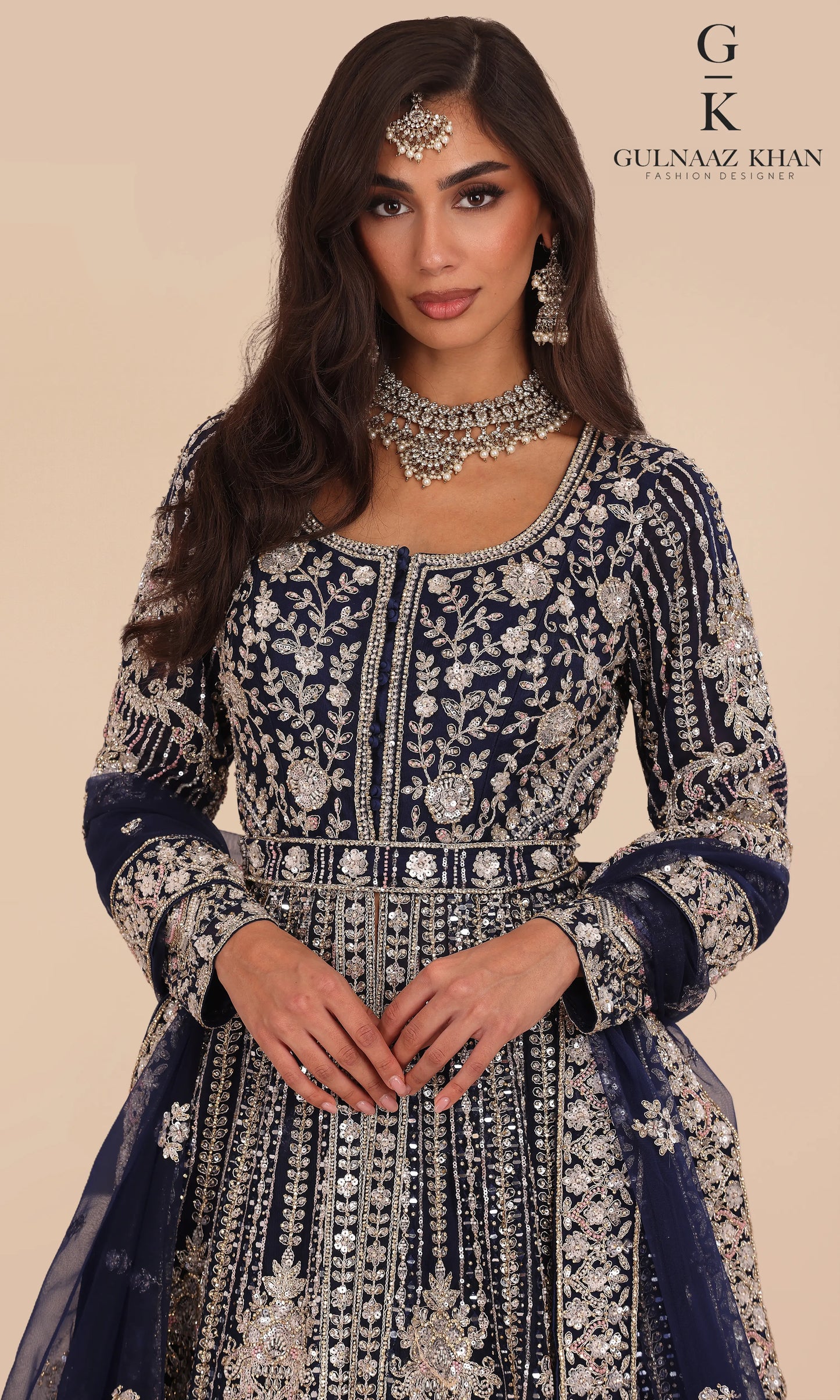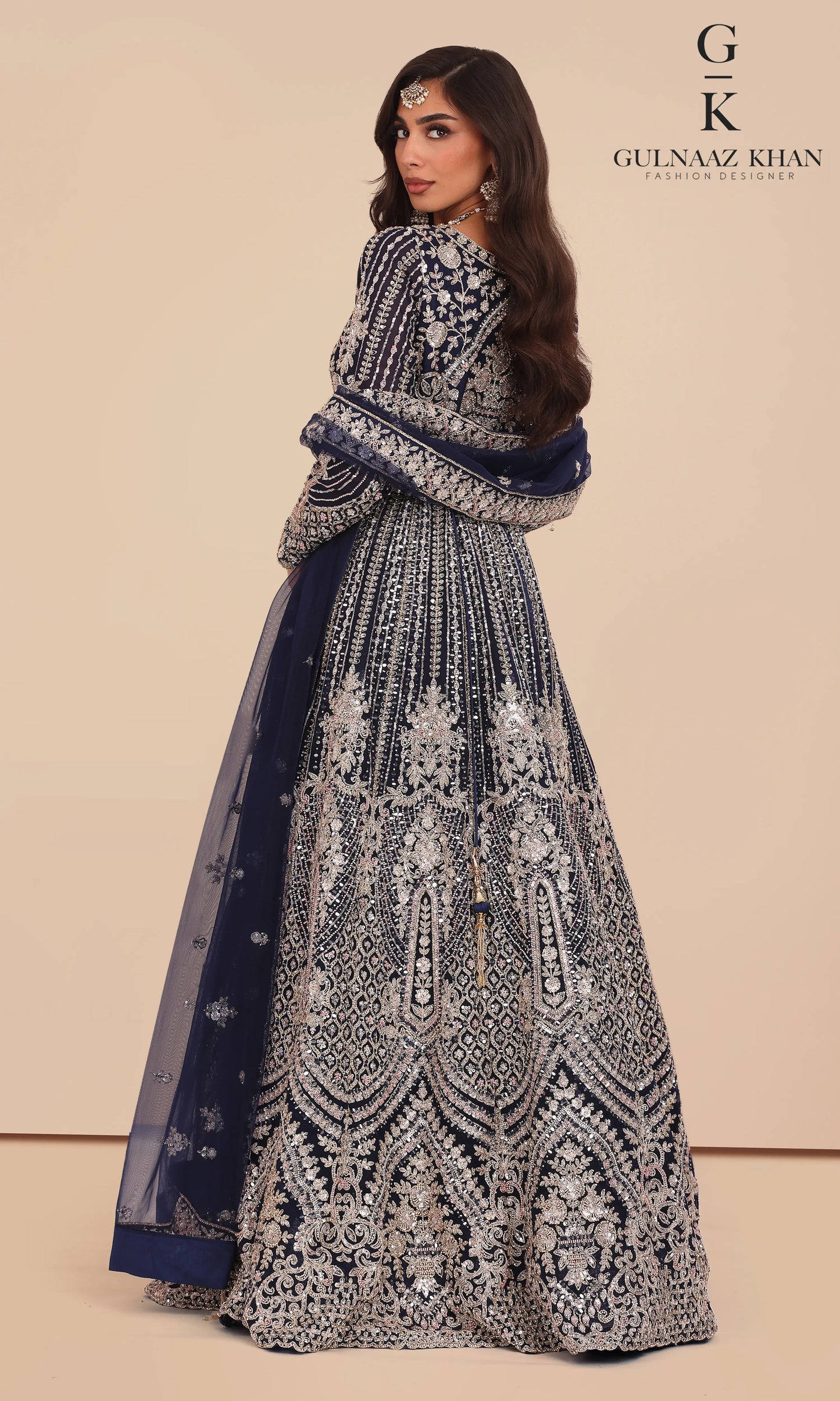 Ziyana is a statement bridal gown designed for women who love timeless luxury. This midnight navy blue jacket-style silhouette features intricate embroidery across the bodice and flare, giving a rich, regal finish in every angle. The outfit is created with a premium blend of net and raw silk, and detailed with heavy sequins, dori, pearls and stone work for maximum shine.