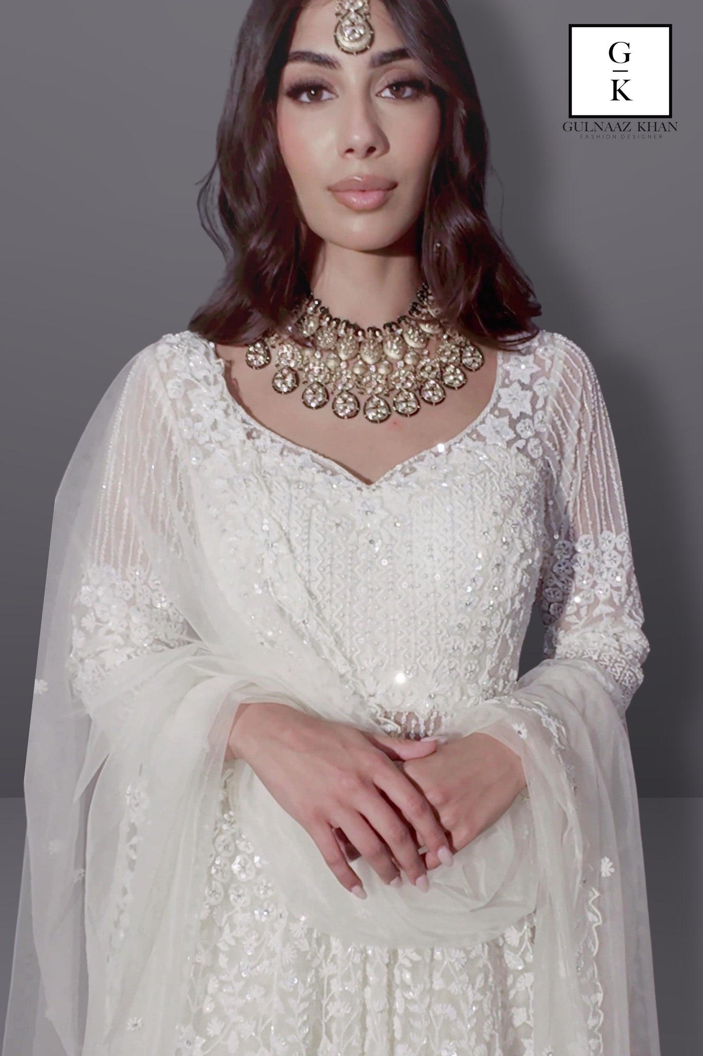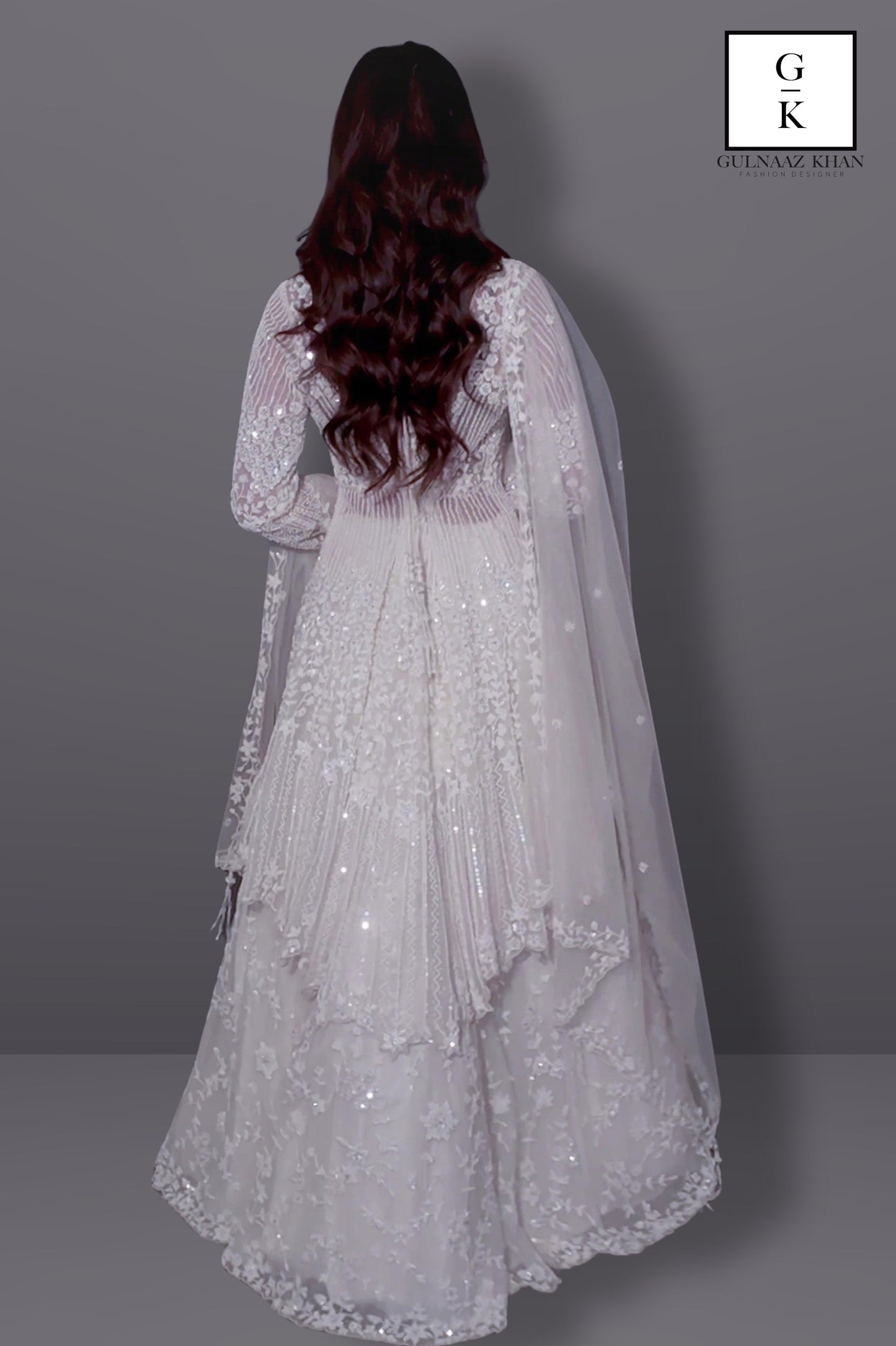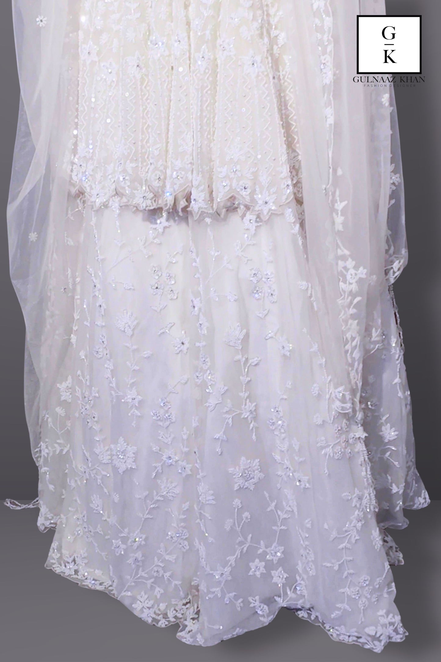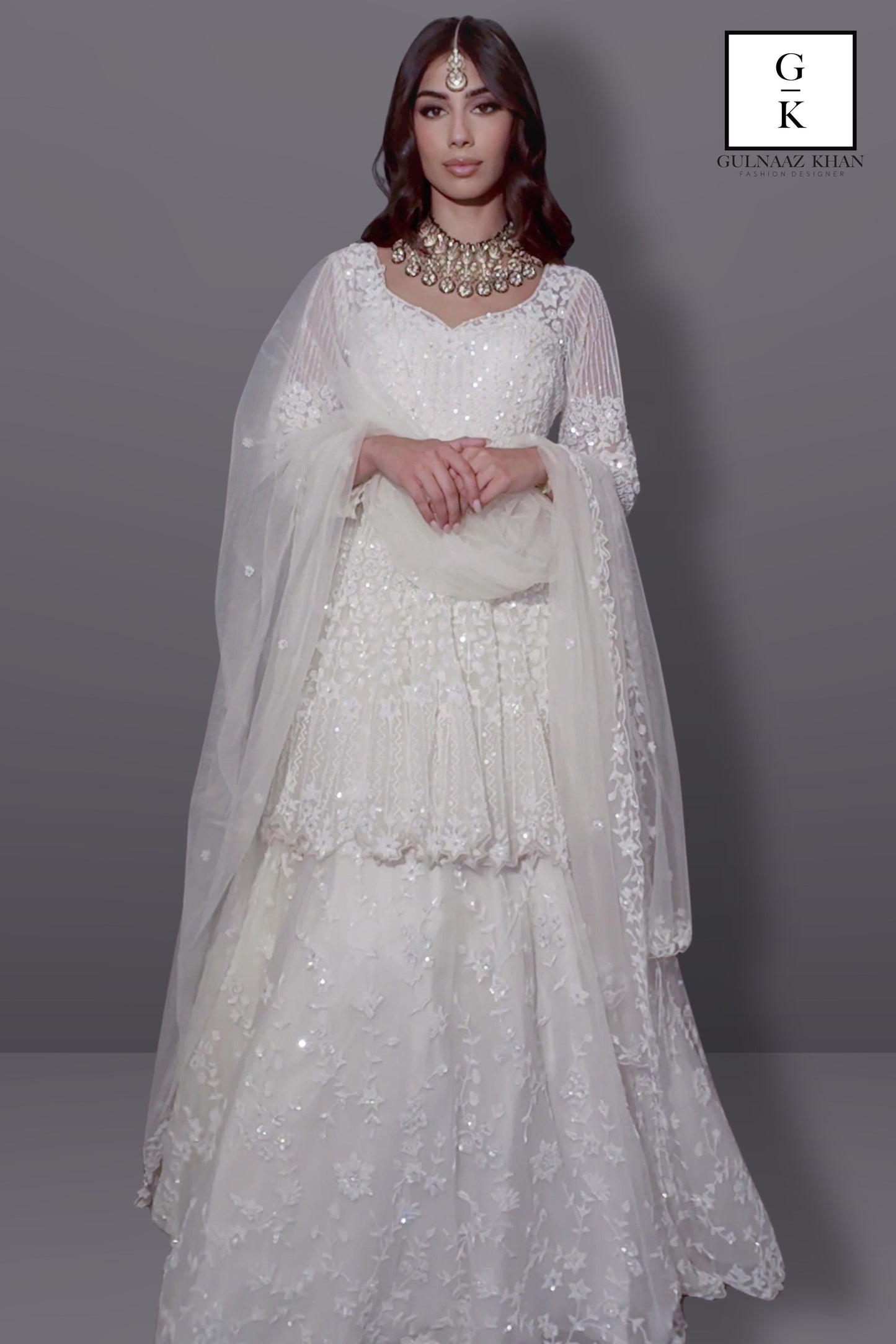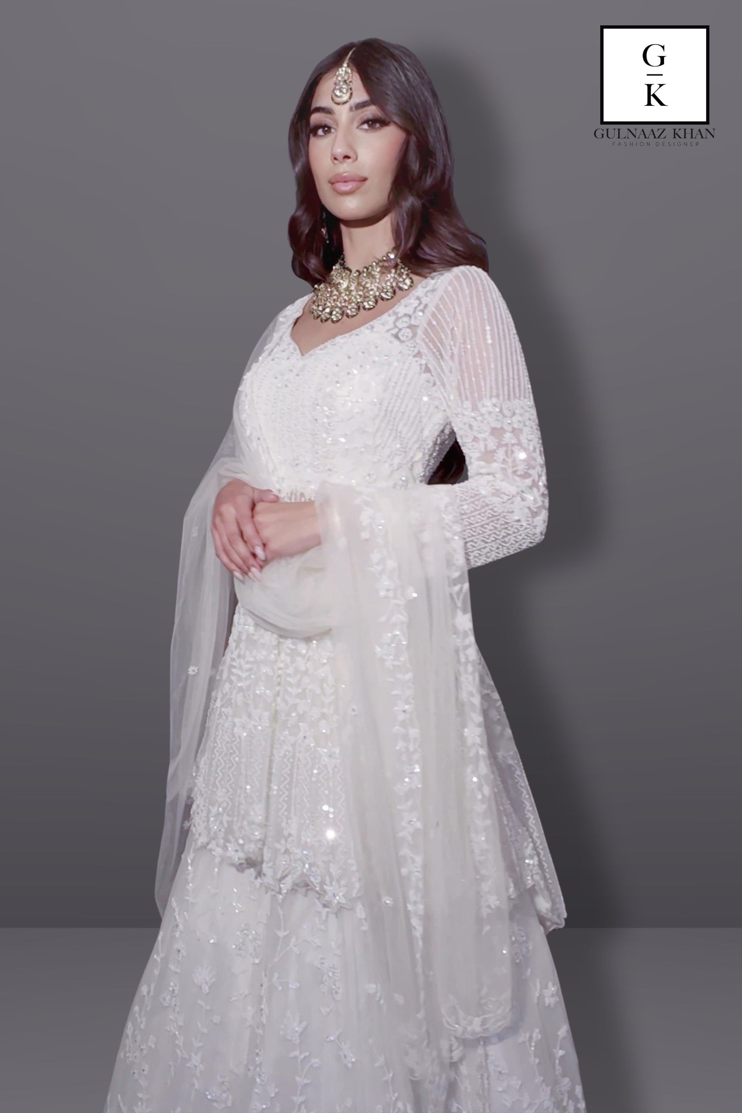 Introducing our exquisite white bridal lehenga, meticulously crafted from premium high-quality net fabric. This stunning ensemble features a unique up-down peplum style that adds a contemporary twist to the traditional lehenga, ensuring you stand out on your special day. The lehenga is adorned with intricate floral cutwork designs that showcase impeccable craftsmanship. The embroidery is further enhanced with glittery sequins and beads, adding a dazzling sparkle that catches the light beautifully. This elaborate detailing covers the entire lehenga, creating a luxurious and elegant appearance. Complementing the lehenga is a matching net dupatta that drapes gracefully, enhancing the overall ethereal look. The outfit also includes full sleeves, providing a sophisticated and modest touch while maintaining a modern aesthetic. Perfect for brides who wish to blend tradition with contemporary flair, this bridal lehenga promises to make your wedding day unforgettable..
