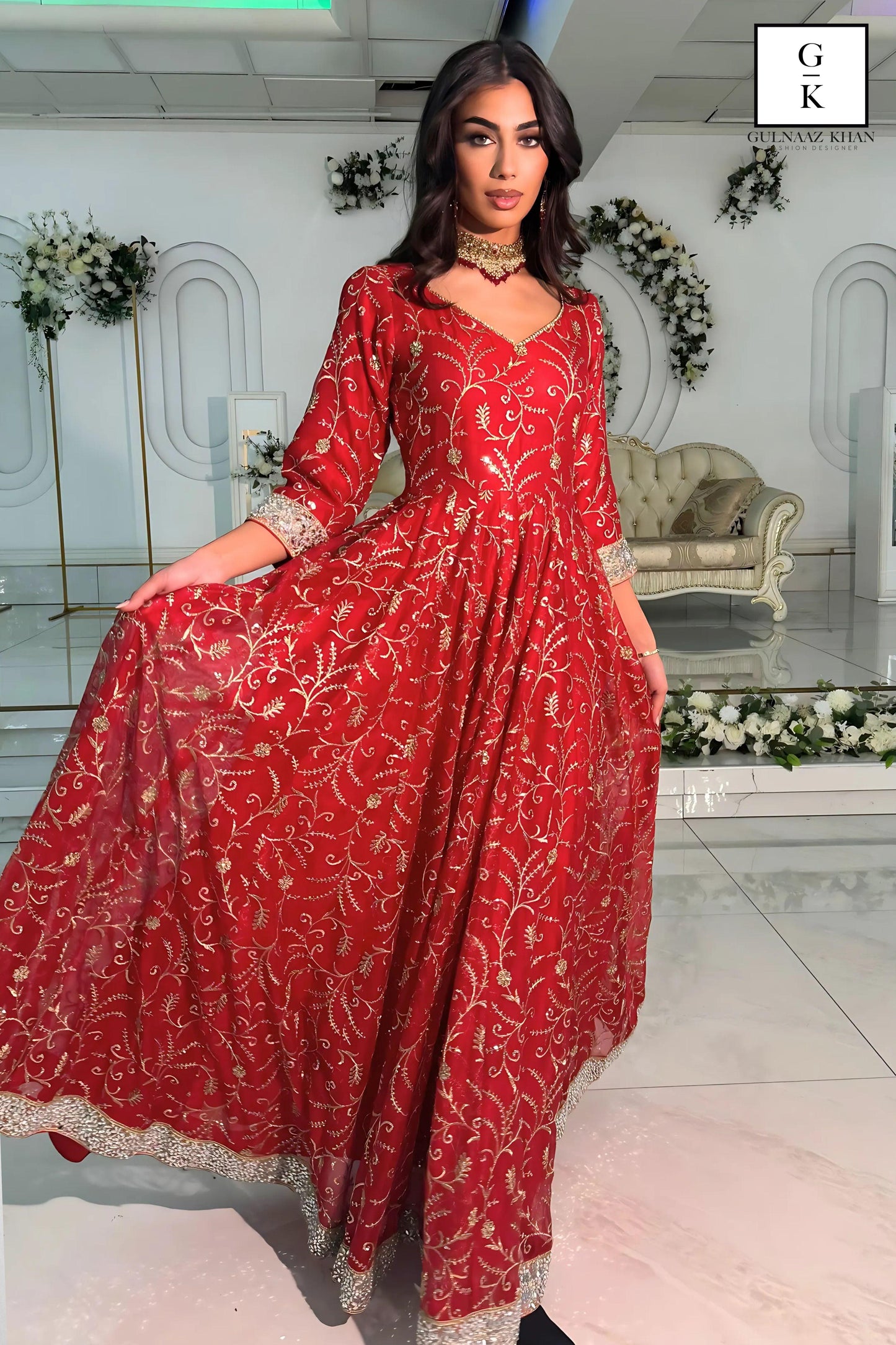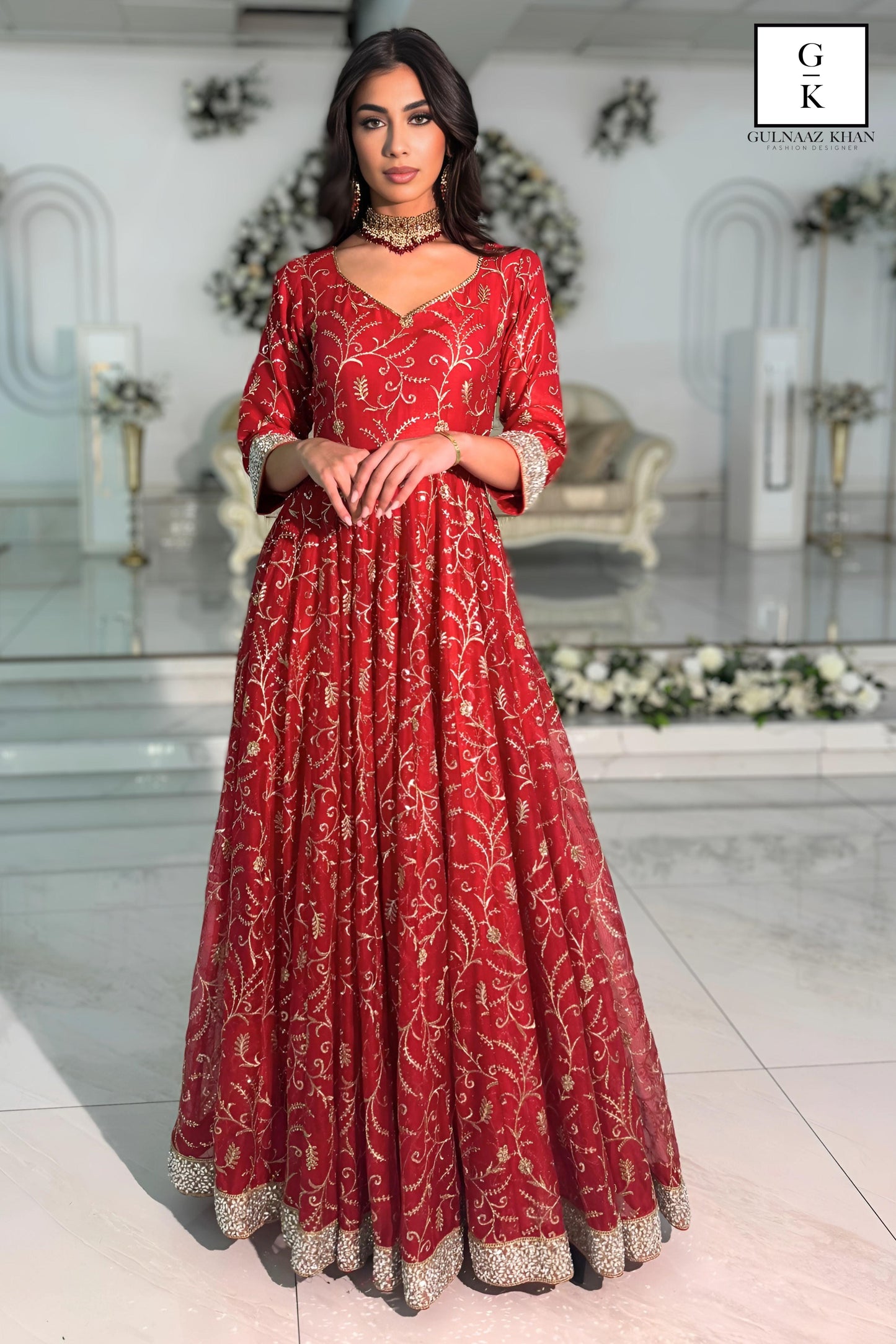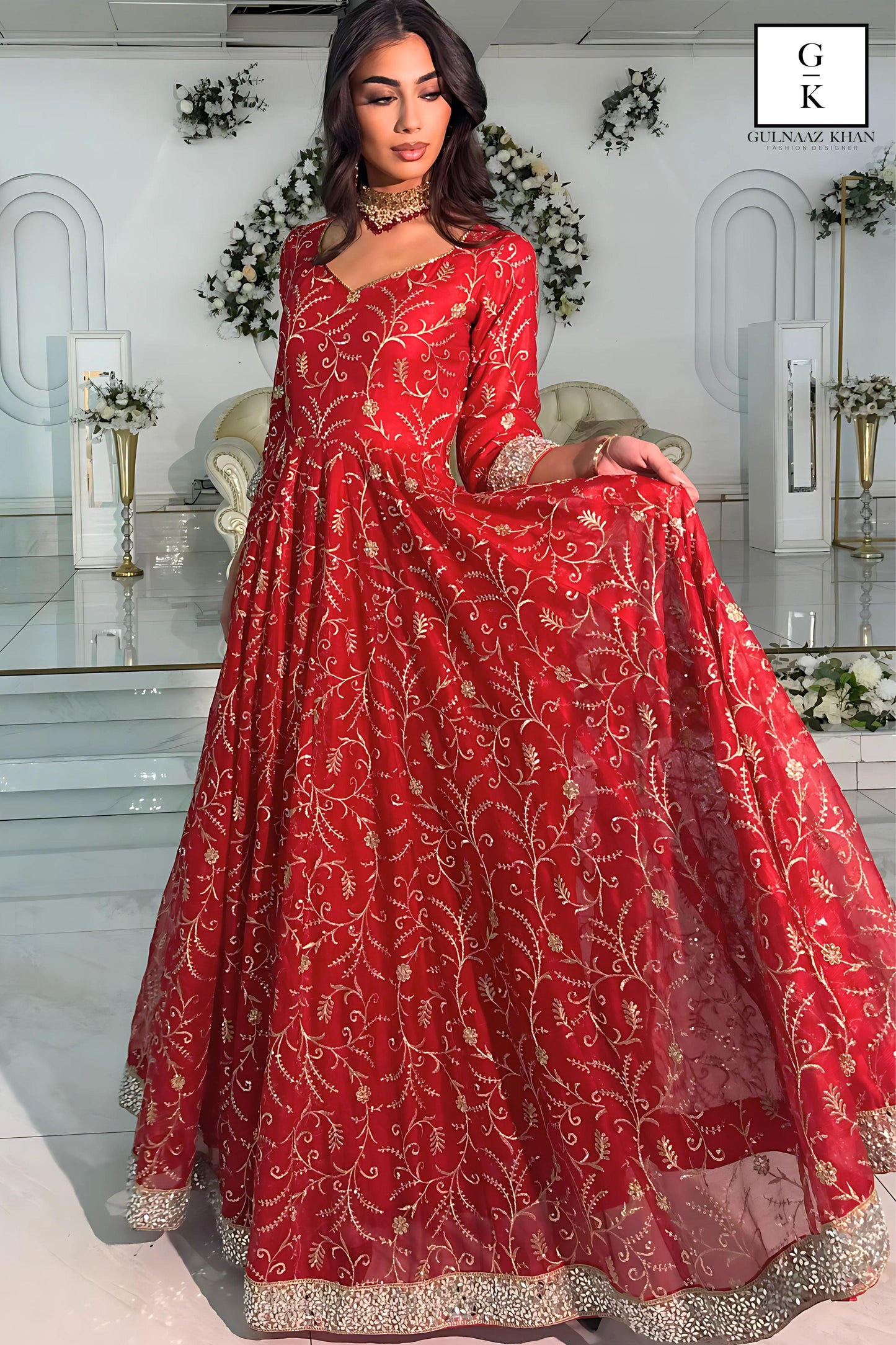 This exquisite red gown is crafted from pure organza fabric, radiating elegance and charm. The intricate zari and sequin embroidery beautifully embellishes the entire gown, creating a luxurious and regal appearance. The sleeves and gown border are adorned with delicate mirror work, adding a dazzling touch to the ensemble. Paired with a matching red organza dupatta featuring detailed embroidery, this outfit is perfect for weddings, festive occasions, or grand celebrations.